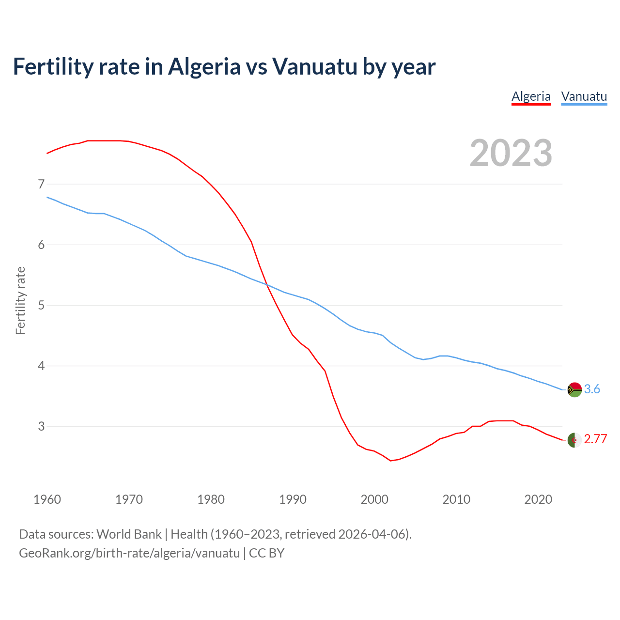 According to the latest available data on birth rates, the fertility rate in Algeria was 2.77 children per woman in 2023, compared to 3.6 in Vanuatu in 2023. The replacement level is considered to be 2.1 children per woman.