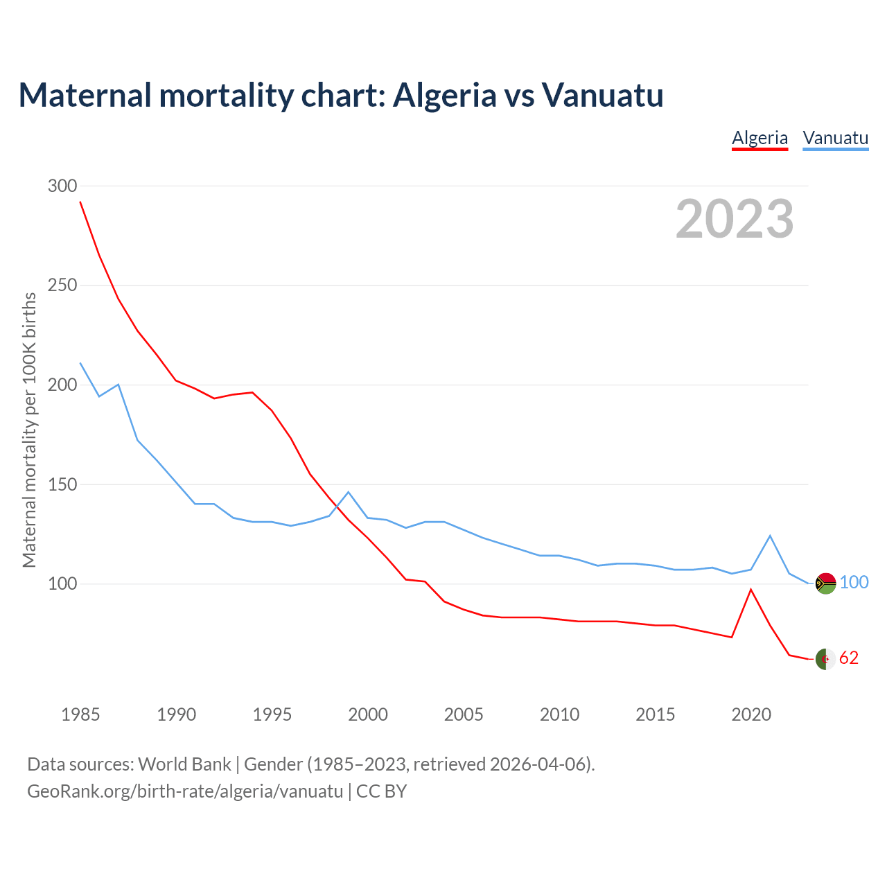 The maternal mortality rate, which is the probability of dying during childbirth or within 42 days of pregnancy termination, is 62 deaths per 100,000 live births in Algeria, compared to 100 deaths in Vanuatu.