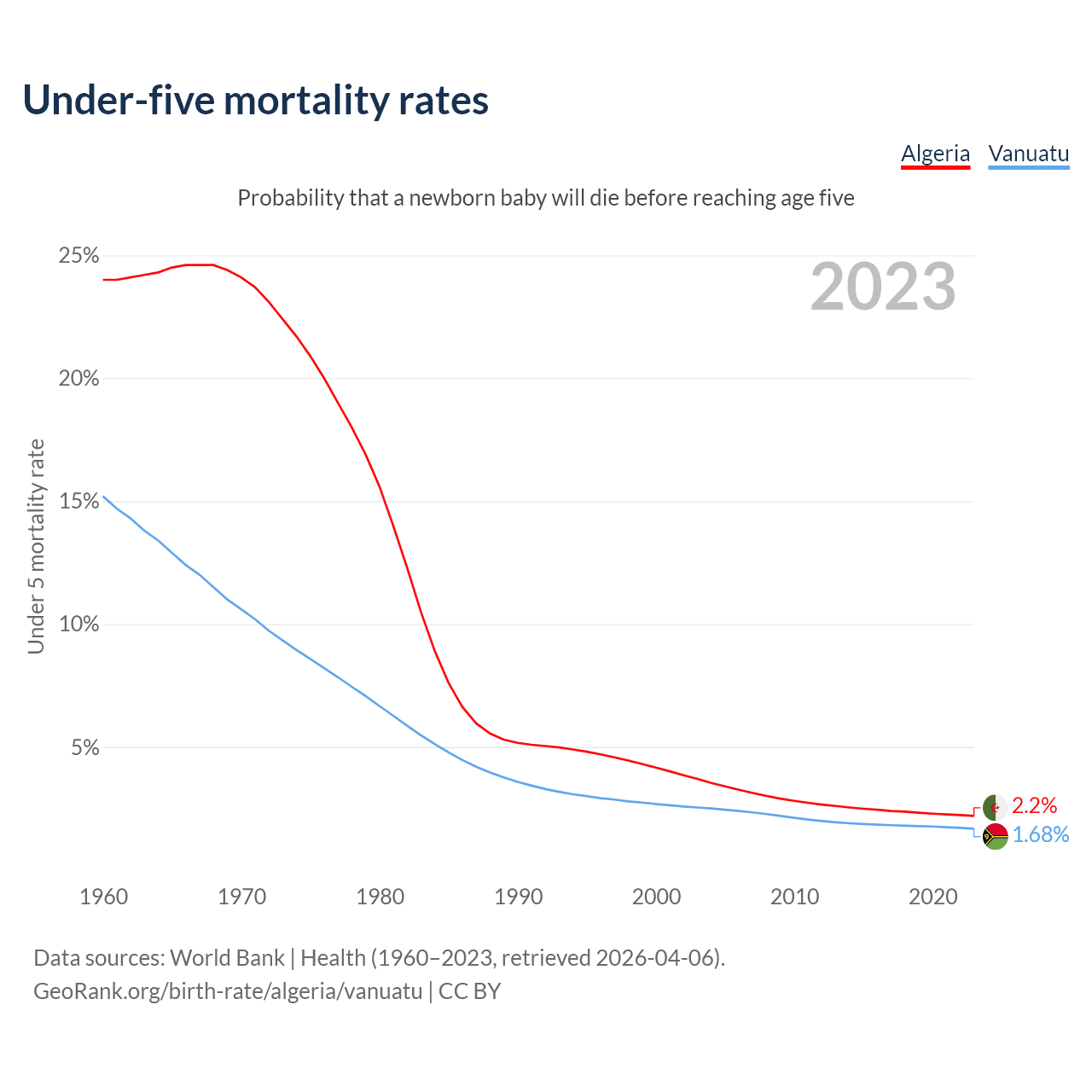 The chance that a newborn baby will die before reaching age five is 2.2% in Algeria and 1.68% in Vanuatu. Above is a chart with historical data on under-five mortality rates.