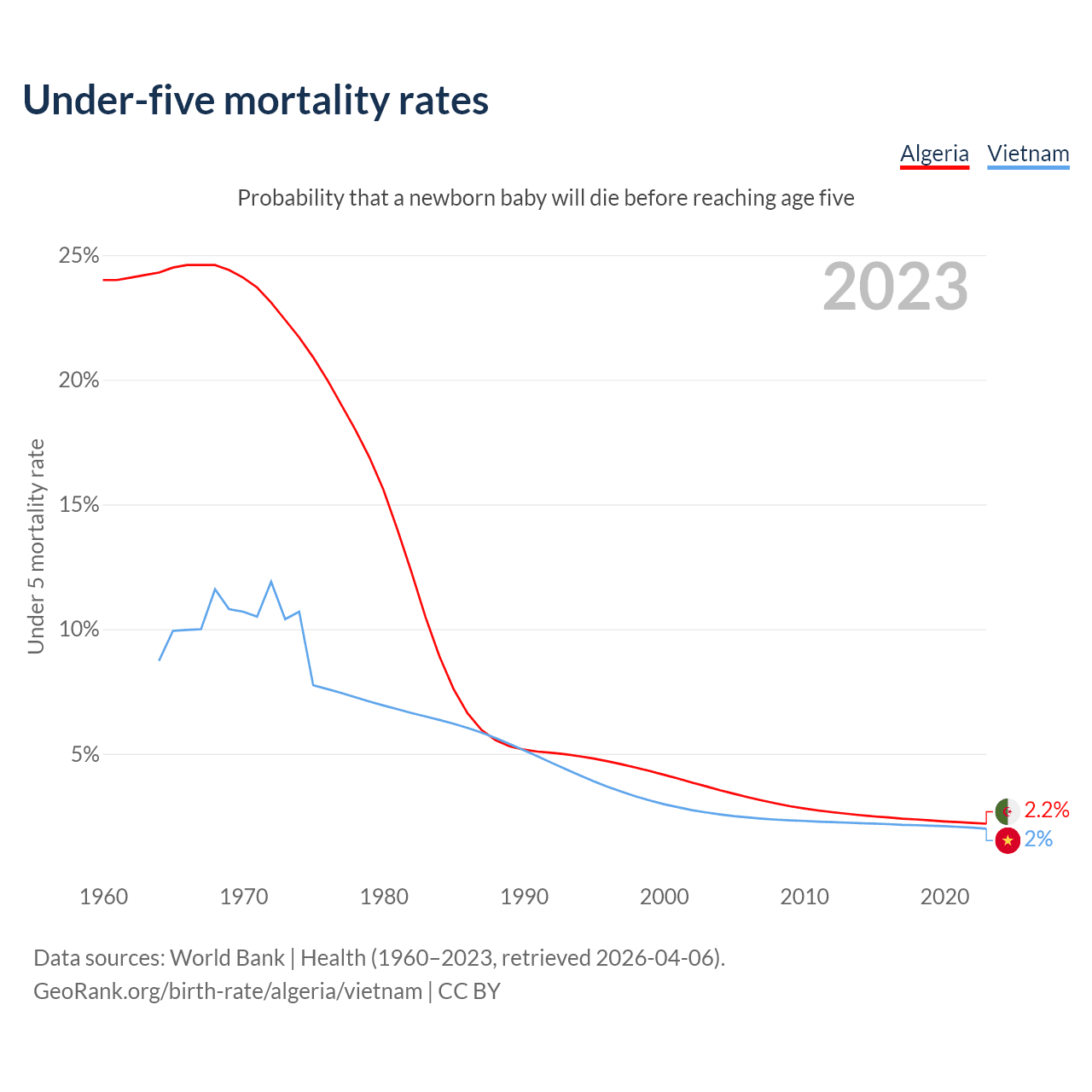 The chance that a newborn baby will die before reaching age five is 2.2% in Algeria and 2% in Vietnam. Above is a chart with historical data on under-five mortality rates.