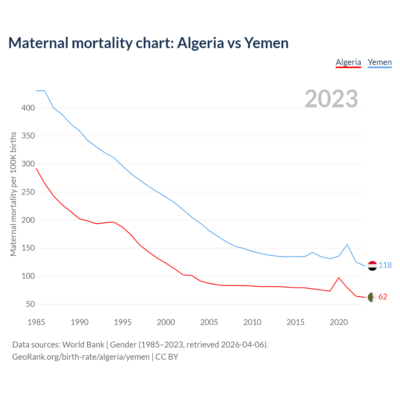The maternal mortality rate, which is the probability of dying during childbirth or within 42 days of pregnancy termination, is 62 deaths per 100,000 live births in Algeria, compared to 118 deaths in Yemen.