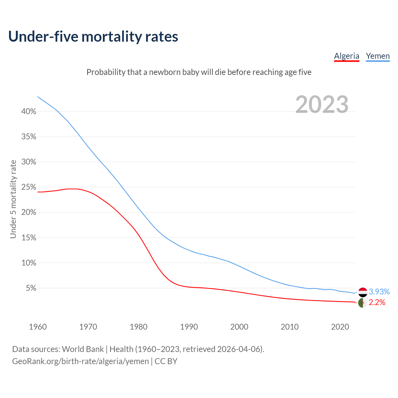 The chance that a newborn baby will die before reaching age five is 2.2% in Algeria and 3.93% in Yemen. Above is a chart with historical data on under-five mortality rates.