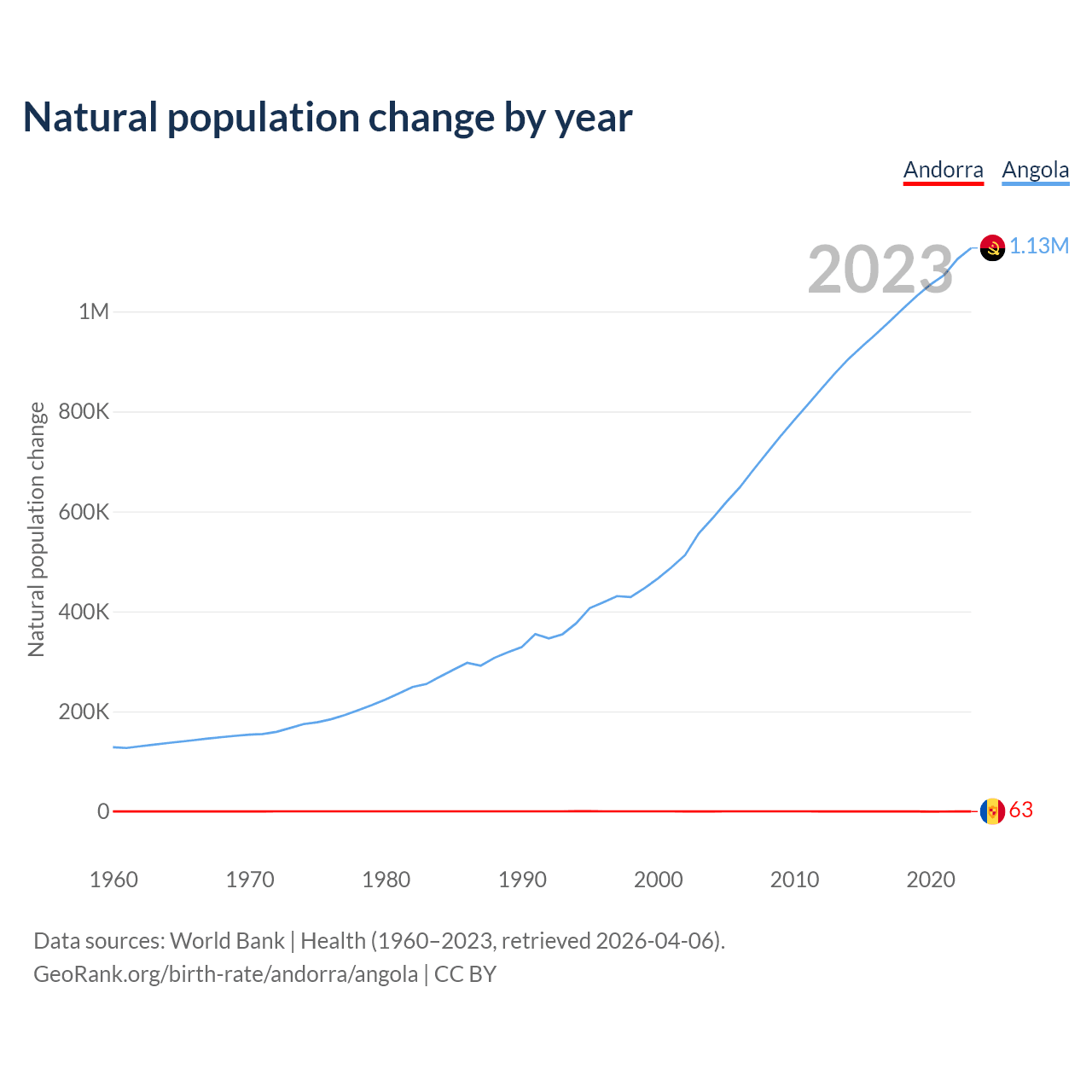 Andorra has an annual birth rate of 6.86 births per 1,000 people, compared to 37.6 for Angola. The average number of children a woman is expected to have during her lifetime — the fertility rate, is 1.08 in Andorra and 5.12 in Angola — 374% difference.