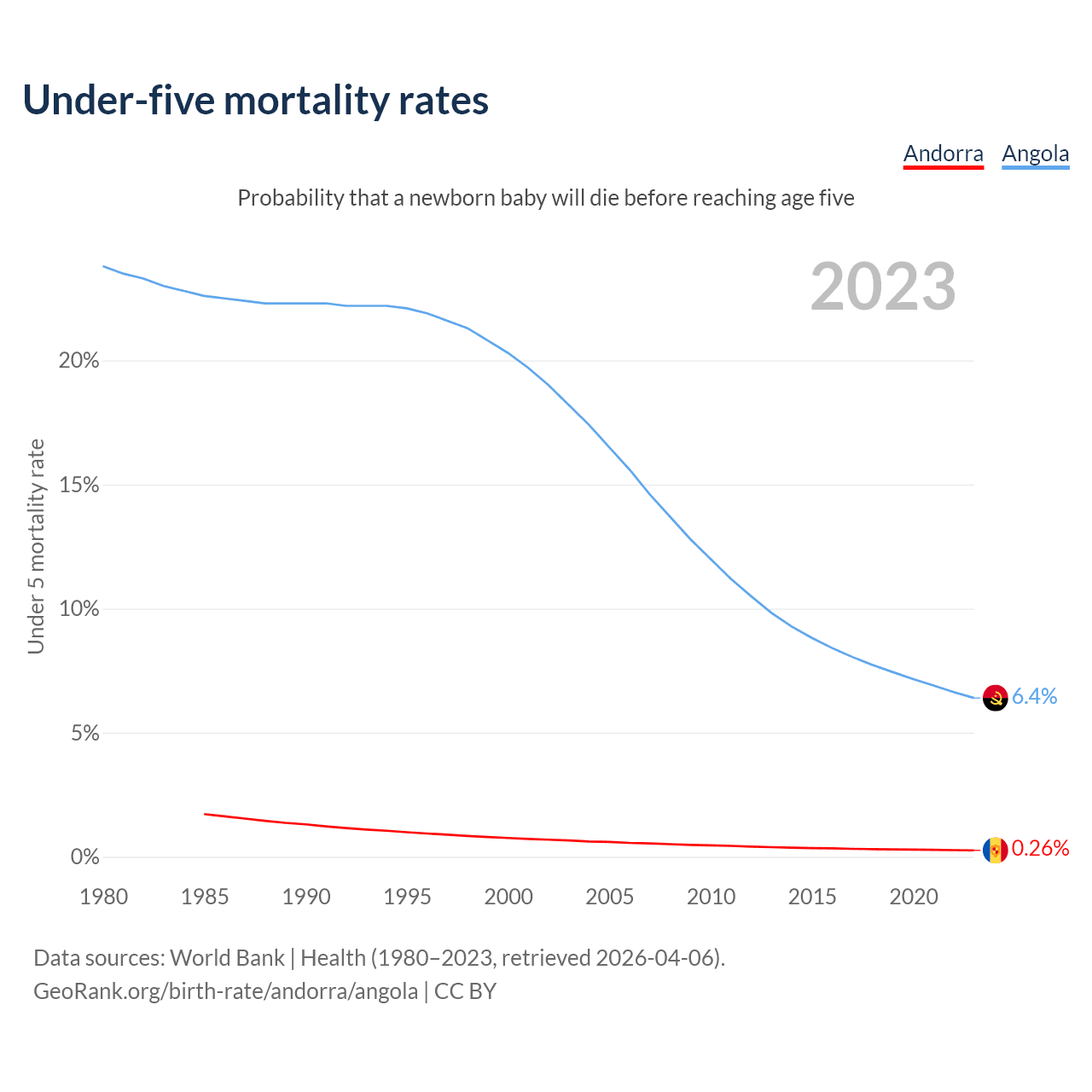 The chance that a newborn baby will die before reaching age five is 0.26% in Andorra and 6.4% in Angola. Above is a chart with historical data on under-five mortality rates.