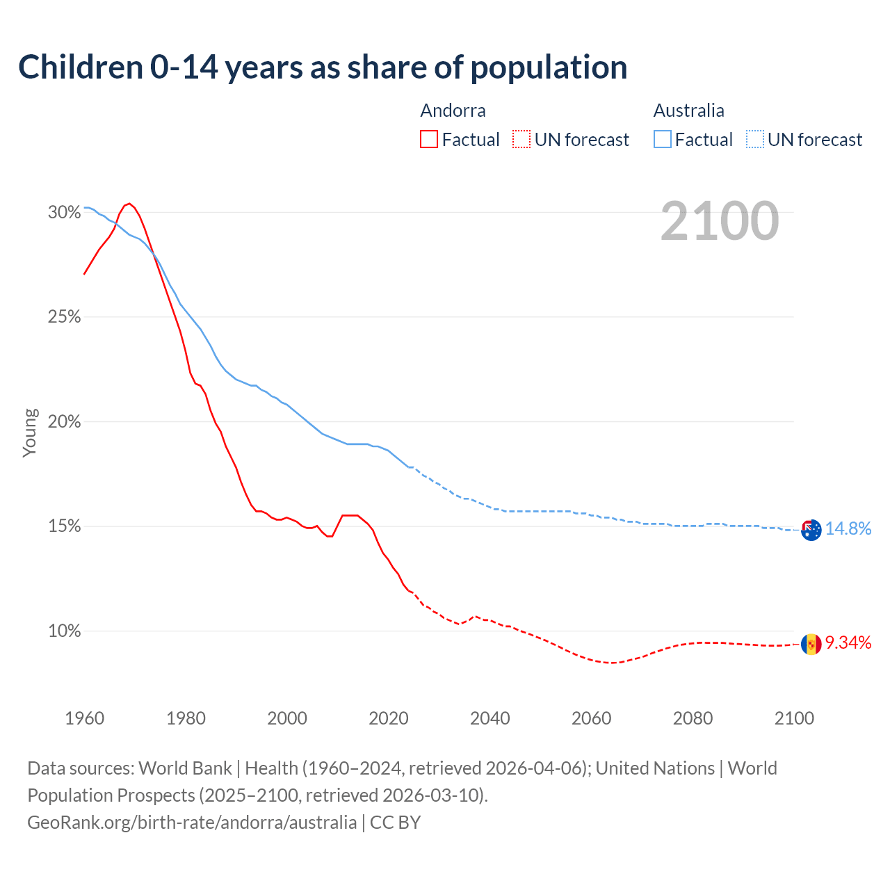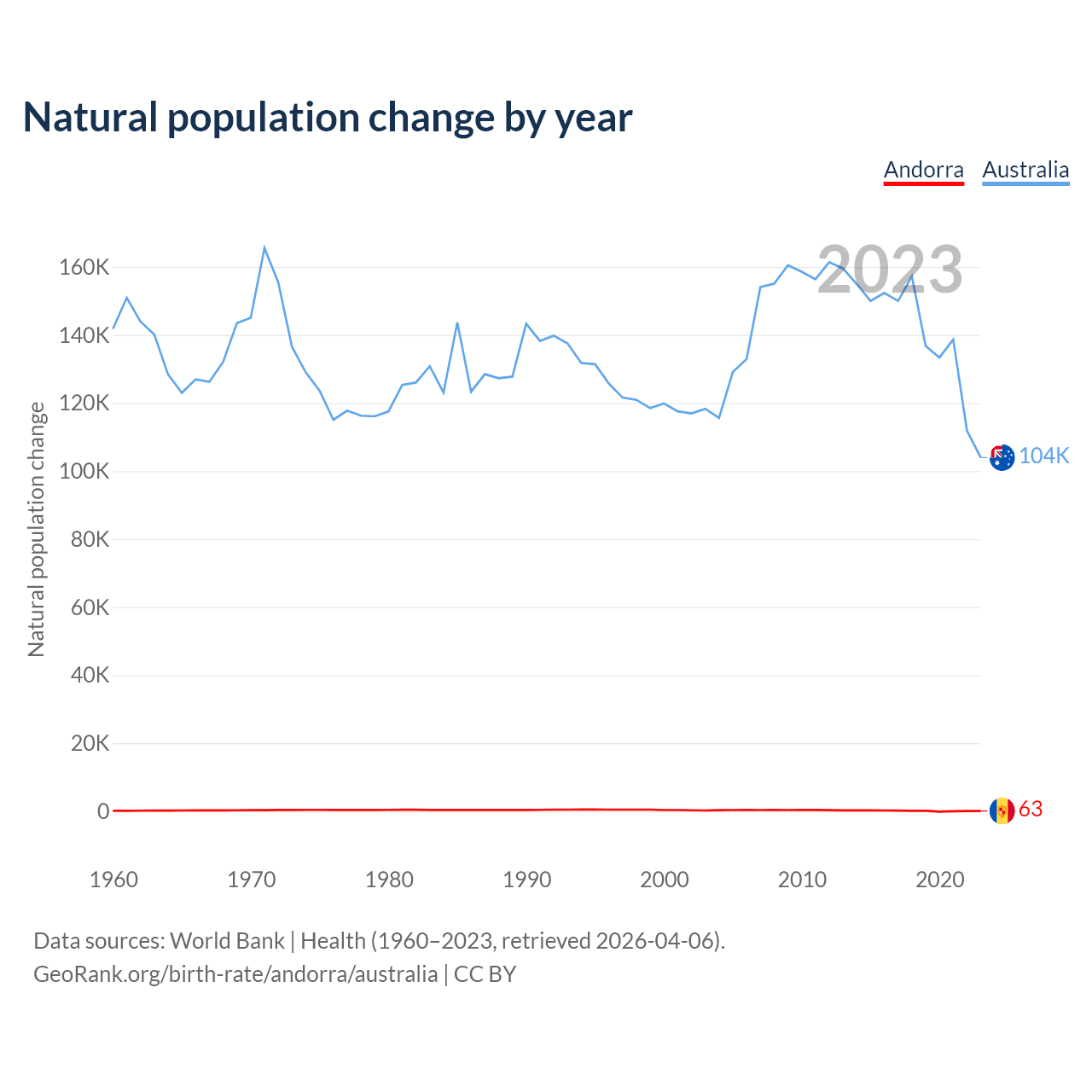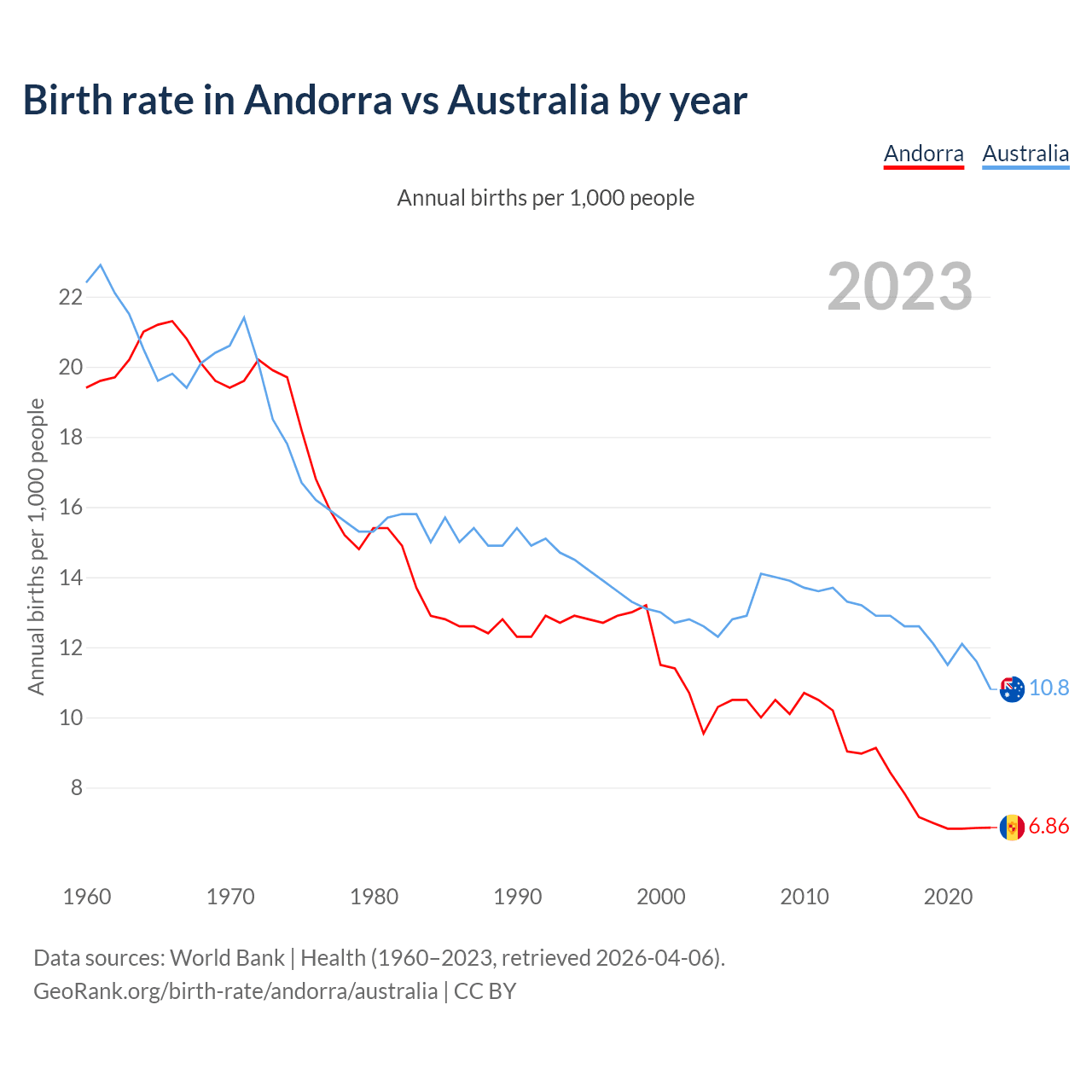 Andorra has an annual birth rate of 6.86 births per 1,000 people, compared to 10.8 for Australia. The average number of children a woman is expected to have during her lifetime — the fertility rate, is 1.08 in Andorra and 1.5 in Australia — 38.6% difference.