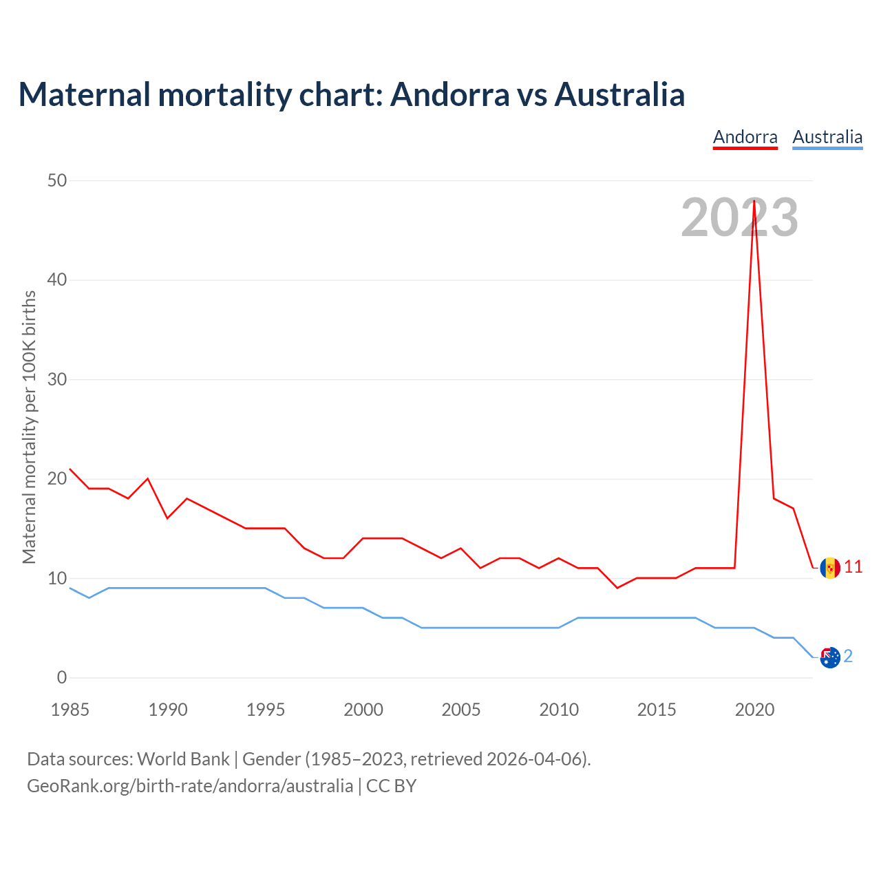 The maternal mortality rate, which is the probability of dying during childbirth or within 42 days of pregnancy termination, is 11 deaths per 100,000 live births in Andorra, compared to 2 deaths in Australia.