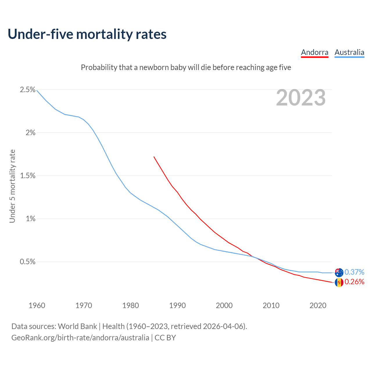 The chance that a newborn baby will die before reaching age five is 0.26% in Andorra and 0.37% in Australia. Above is a chart with historical data on under-five mortality rates.