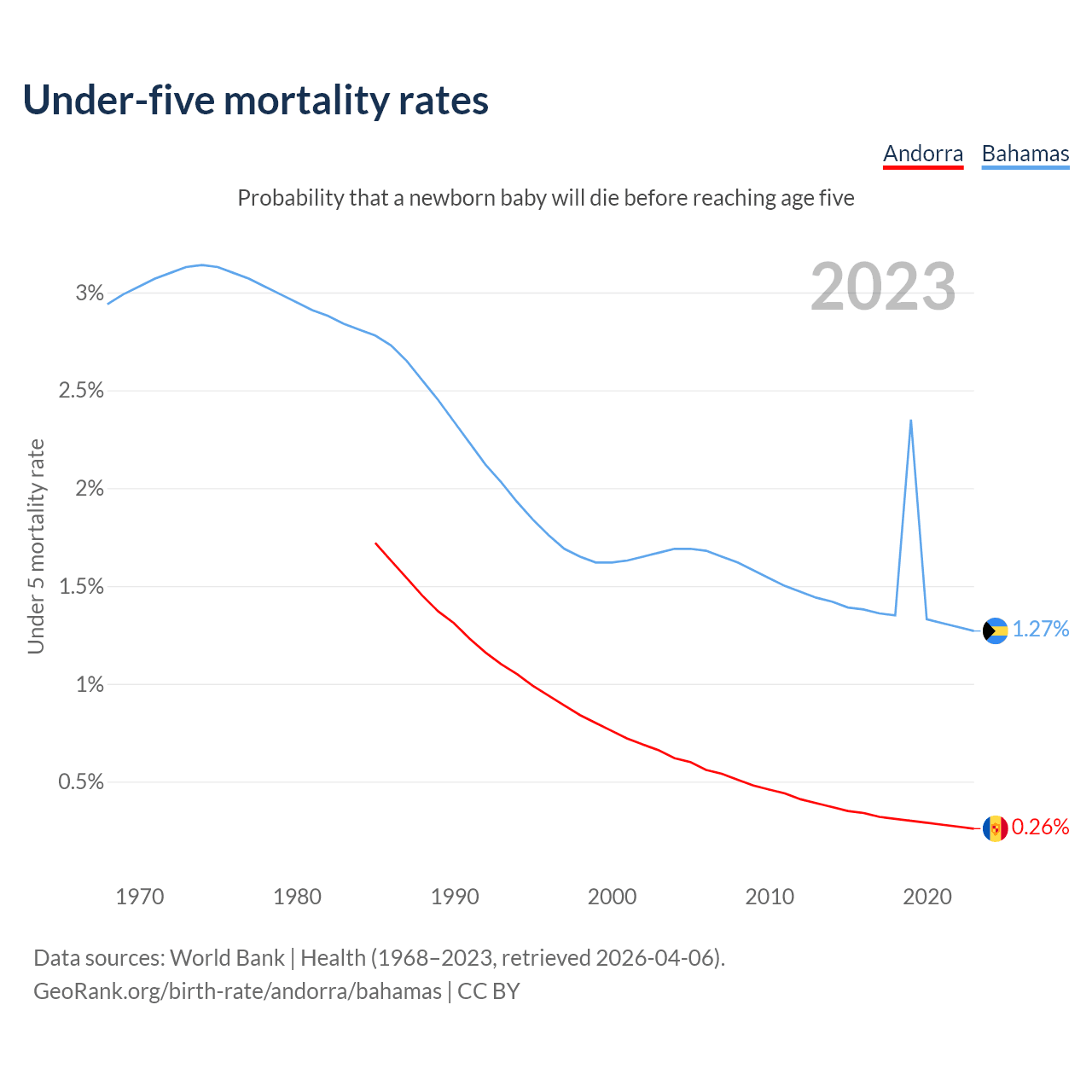 The chance that a newborn baby will die before reaching age five is 0.26% in Andorra and 1.27% in the Bahamas. Above is a chart with historical data on under-five mortality rates.