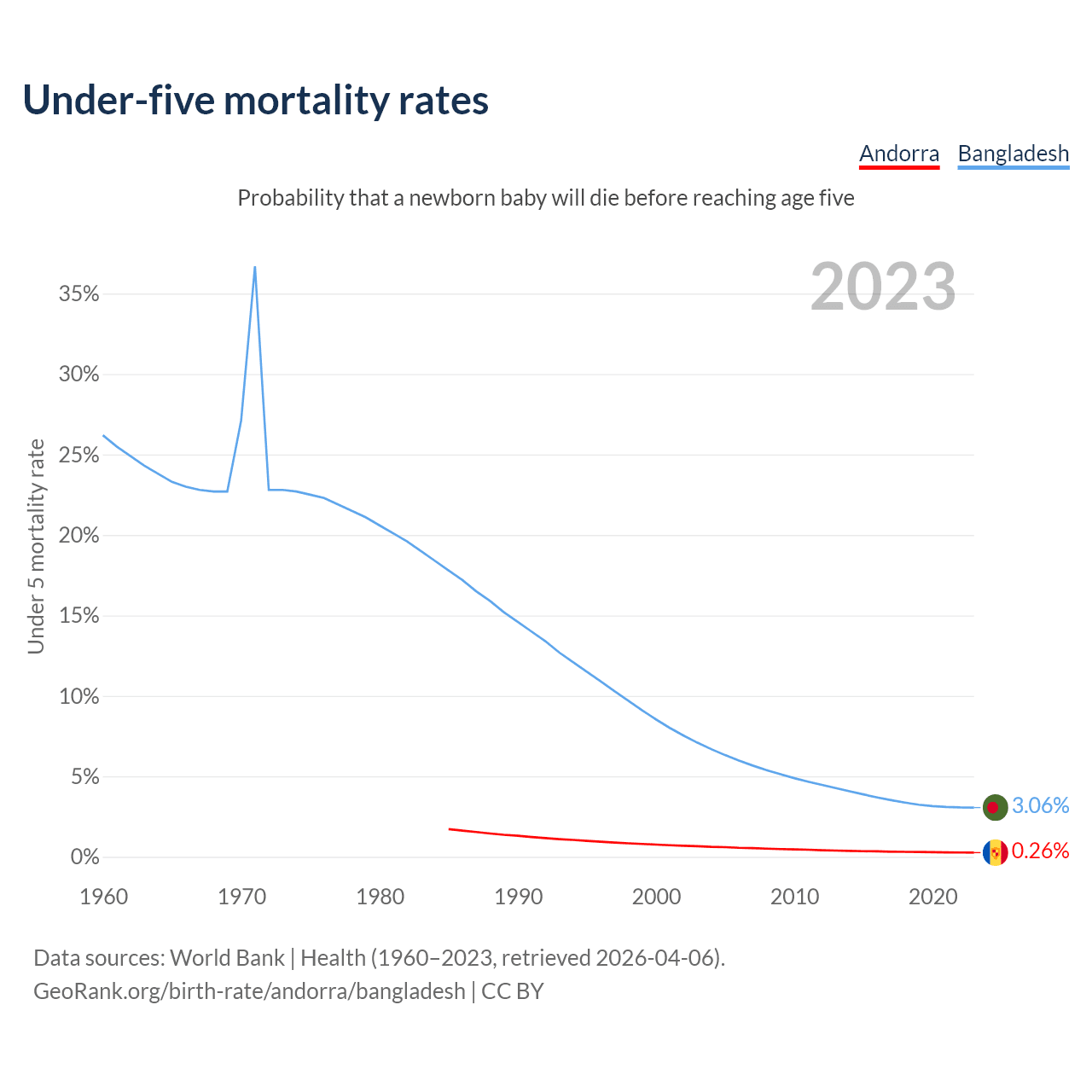 The chance that a newborn baby will die before reaching age five is 0.26% in Andorra and 3.06% in Bangladesh. Above is a chart with historical data on under-five mortality rates.