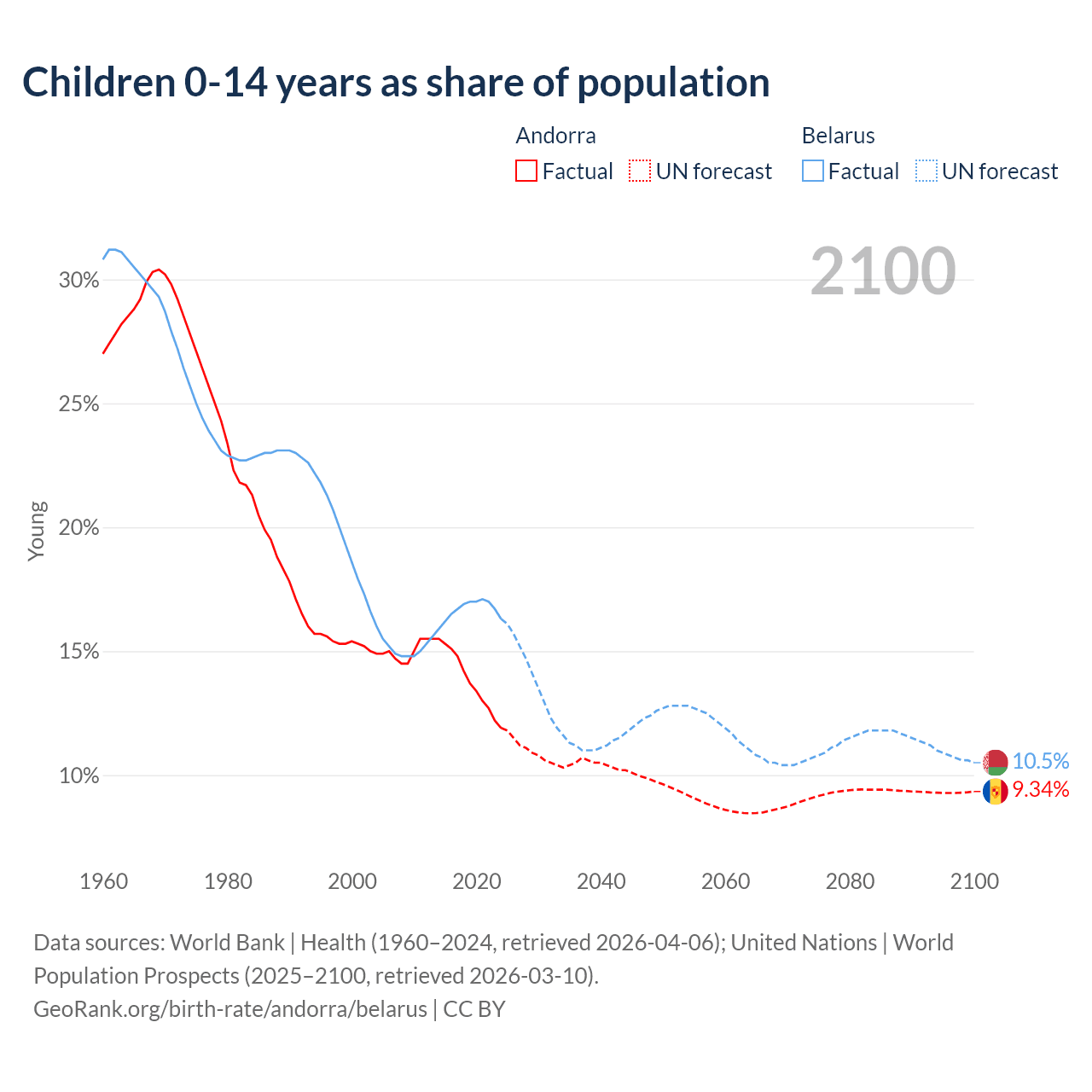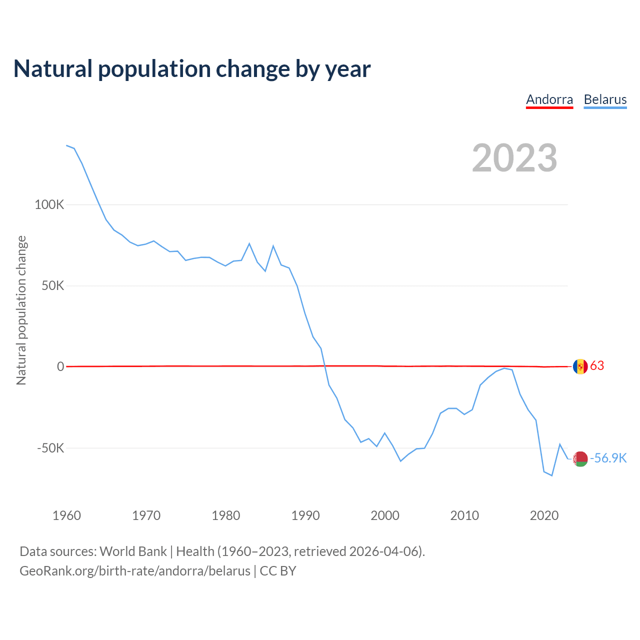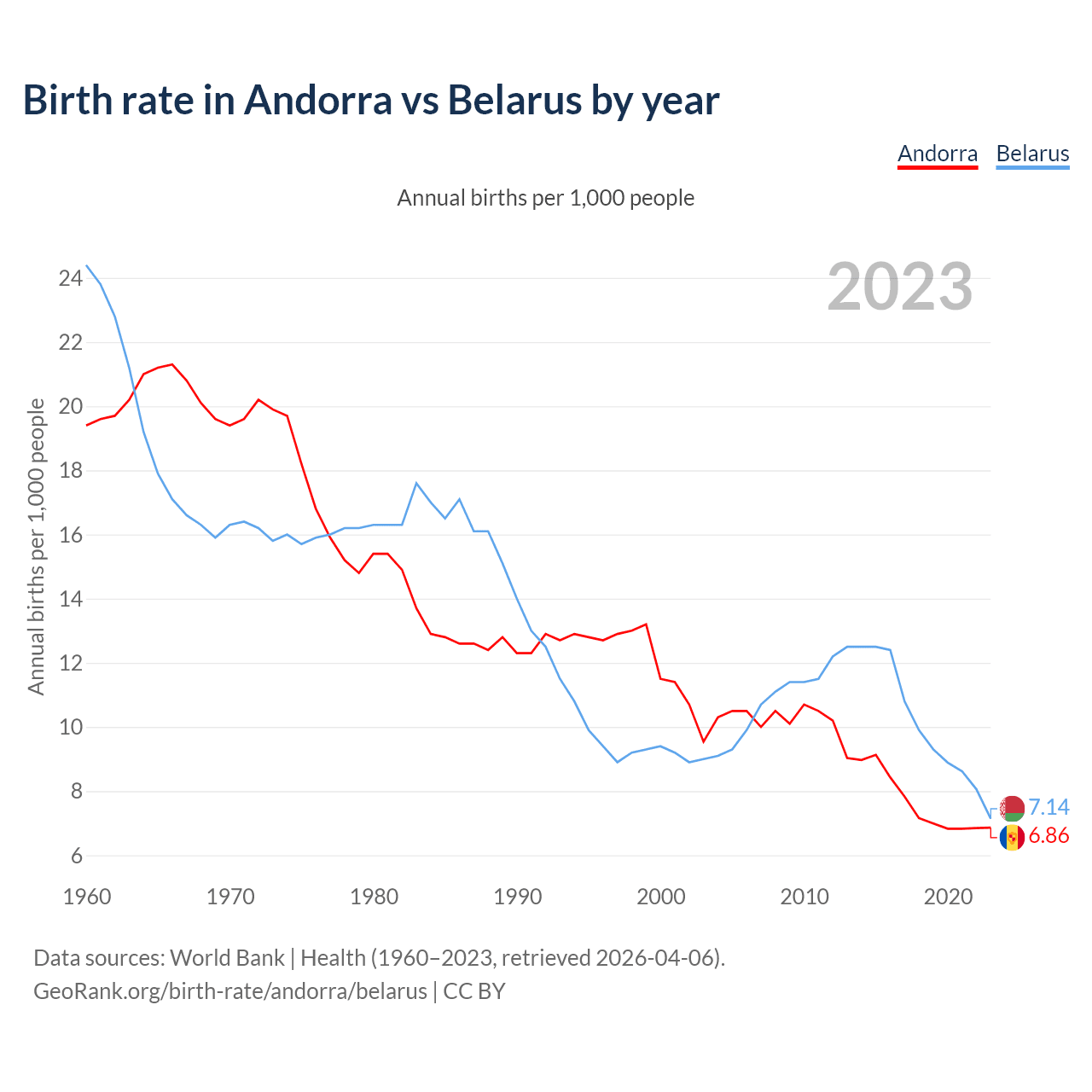According to the latest available data on birth rates, the fertility rate in Andorra was 1.08 children per woman in 2023, compared to 1.21 in Belarus in 2023. The replacement level is considered to be 2.1 children per woman.