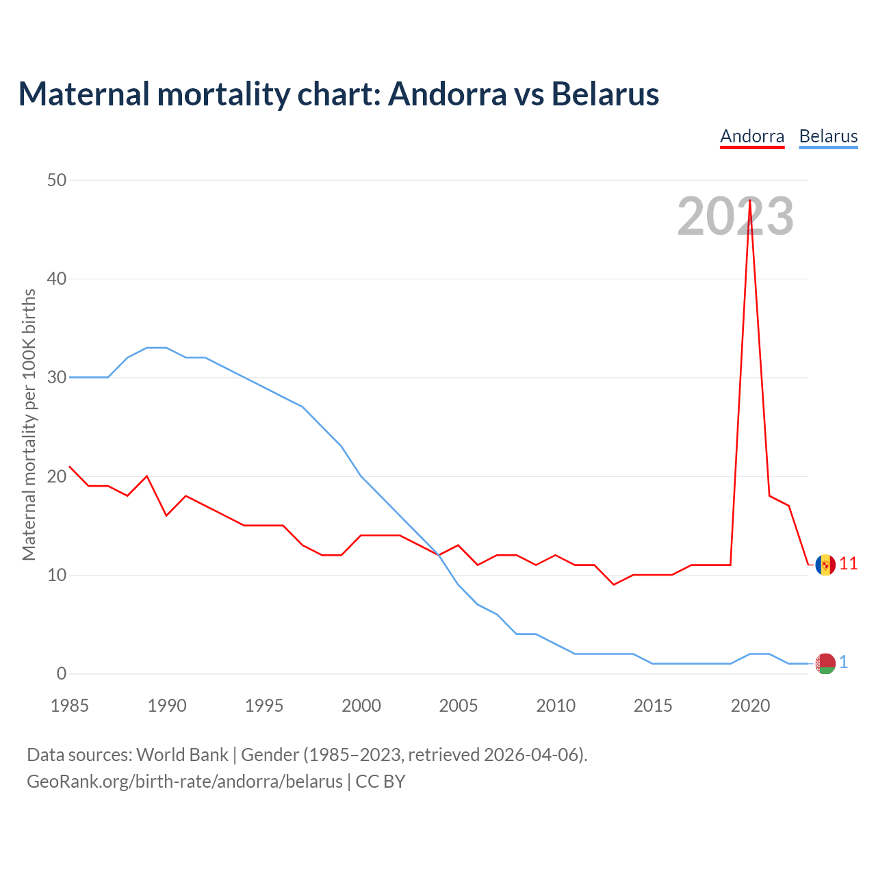 The maternal mortality rate, which is the probability of dying during childbirth or within 42 days of pregnancy termination, is 11 deaths per 100,000 live births in Andorra, compared to 1 deaths in Belarus.