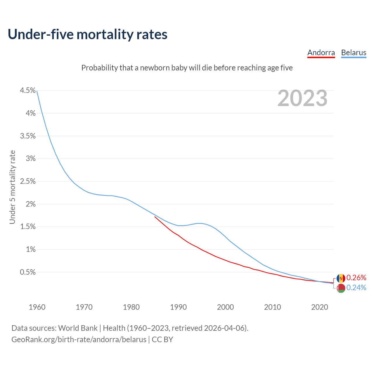 The chance that a newborn baby will die before reaching age five is 0.26% in Andorra and 0.24% in Belarus. Above is a chart with historical data on under-five mortality rates.