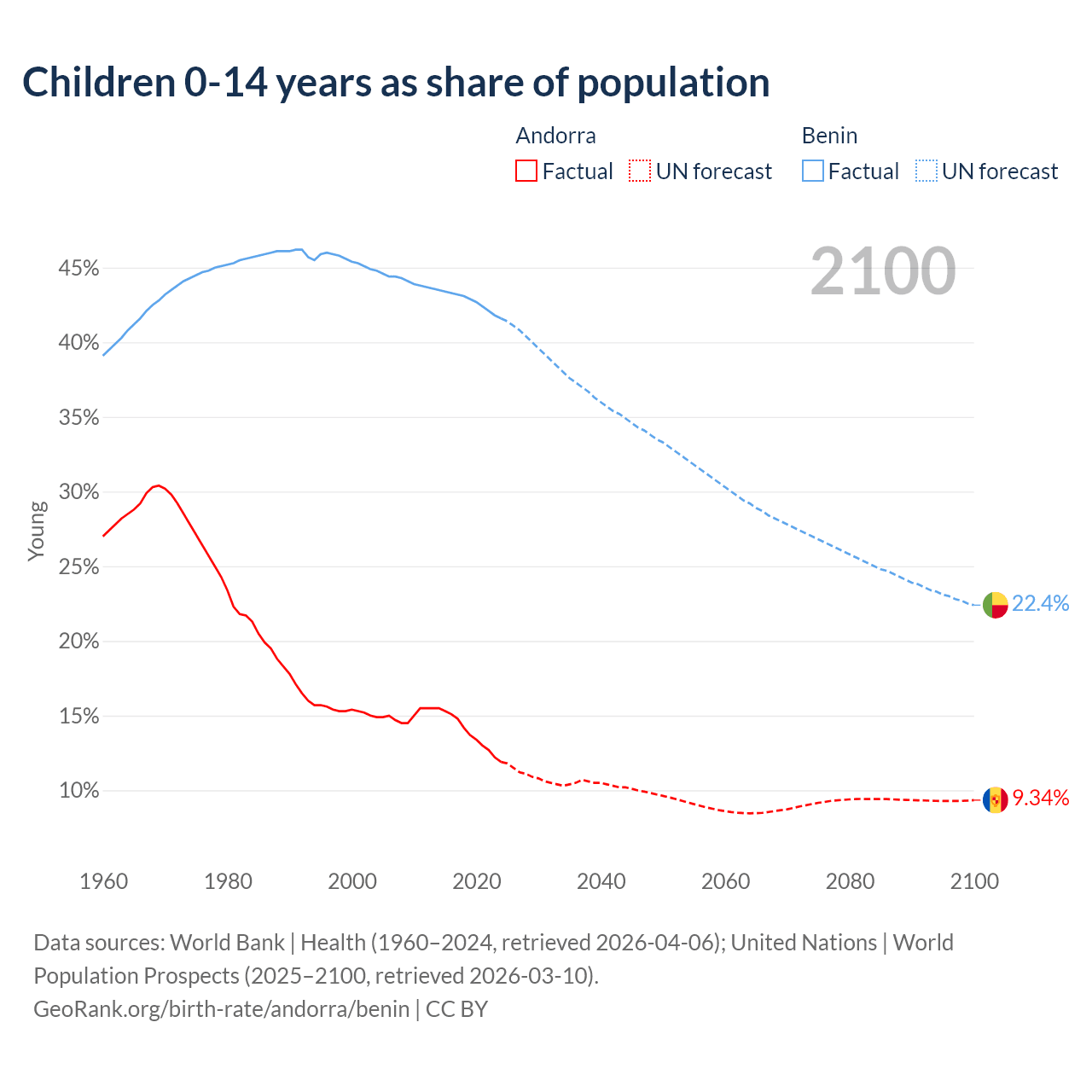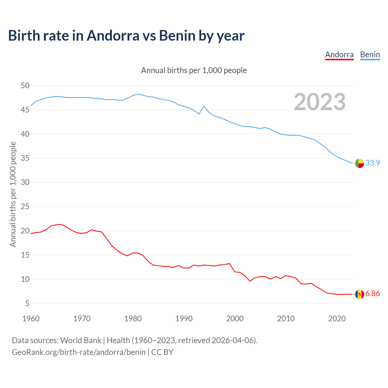 Andorra has an annual birth rate of 6.86 births per 1,000 people, compared to 33.9 for Benin. The average number of children a woman is expected to have during her lifetime — the fertility rate, is 1.08 in Andorra and 4.56 in Benin — 321% difference.