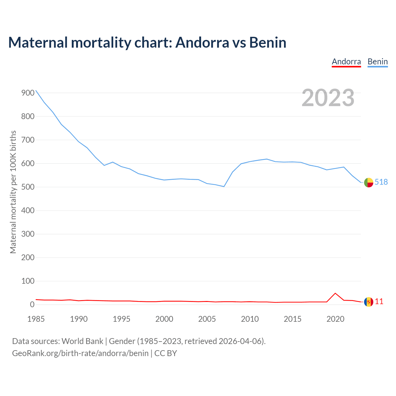 The maternal mortality rate, which is the probability of dying during childbirth or within 42 days of pregnancy termination, is 11 deaths per 100,000 live births in Andorra, compared to 518 deaths in Benin.