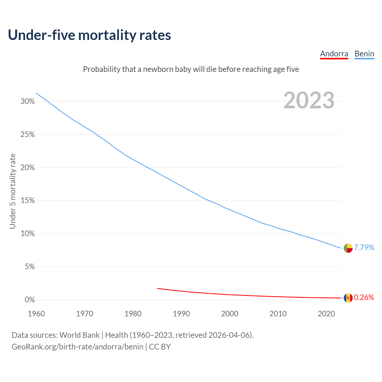 The chance that a newborn baby will die before reaching age five is 0.26% in Andorra and 7.79% in Benin. Above is a chart with historical data on under-five mortality rates.