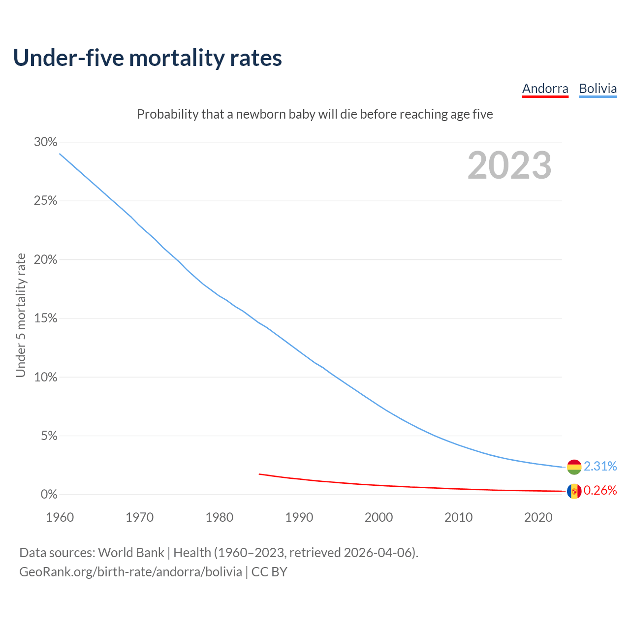 The chance that a newborn baby will die before reaching age five is 0.26% in Andorra and 2.31% in Bolivia. Above is a chart with historical data on under-five mortality rates.