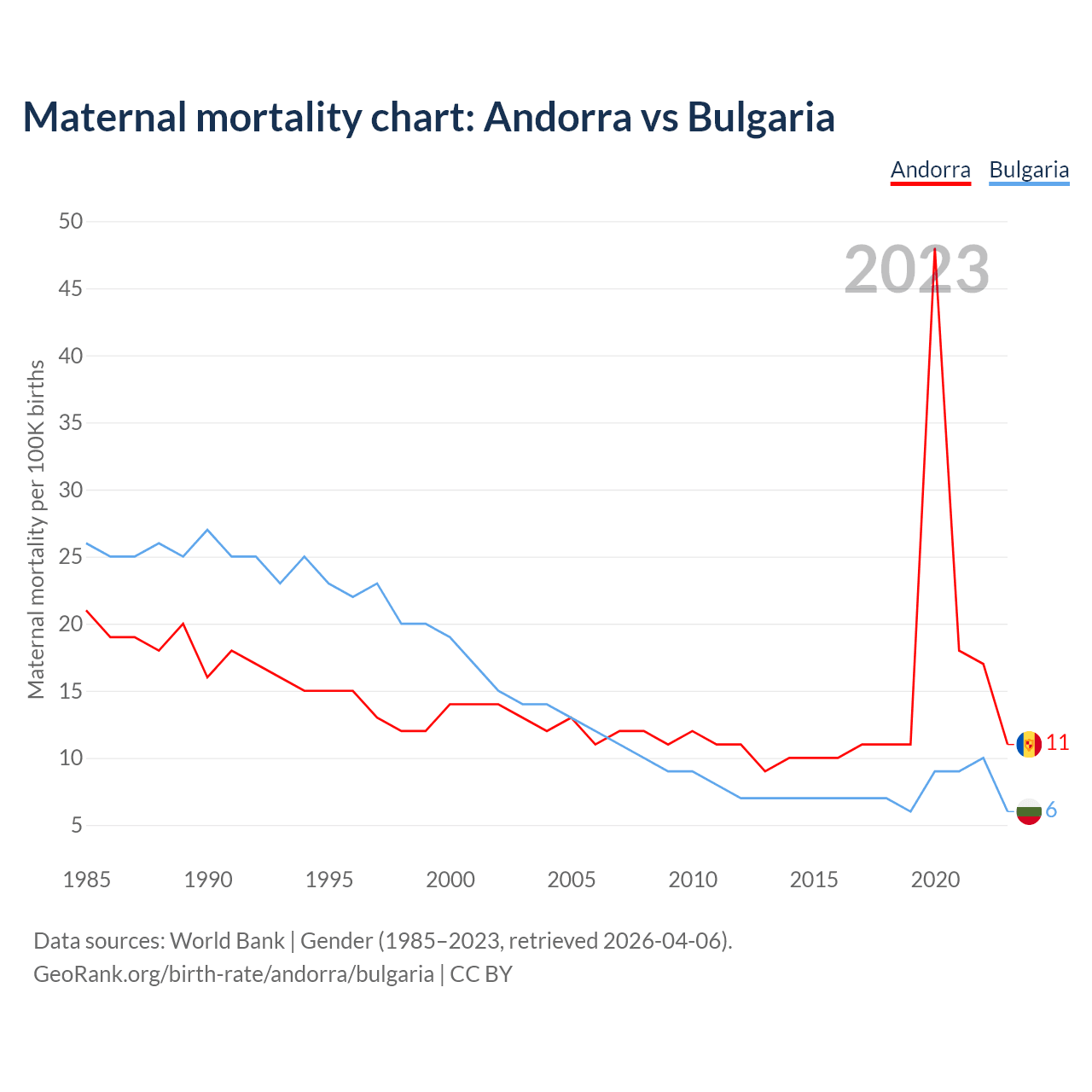 The maternal mortality rate, which is the probability of dying during childbirth or within 42 days of pregnancy termination, is 11 deaths per 100,000 live births in Andorra, compared to 6 deaths in Bulgaria.