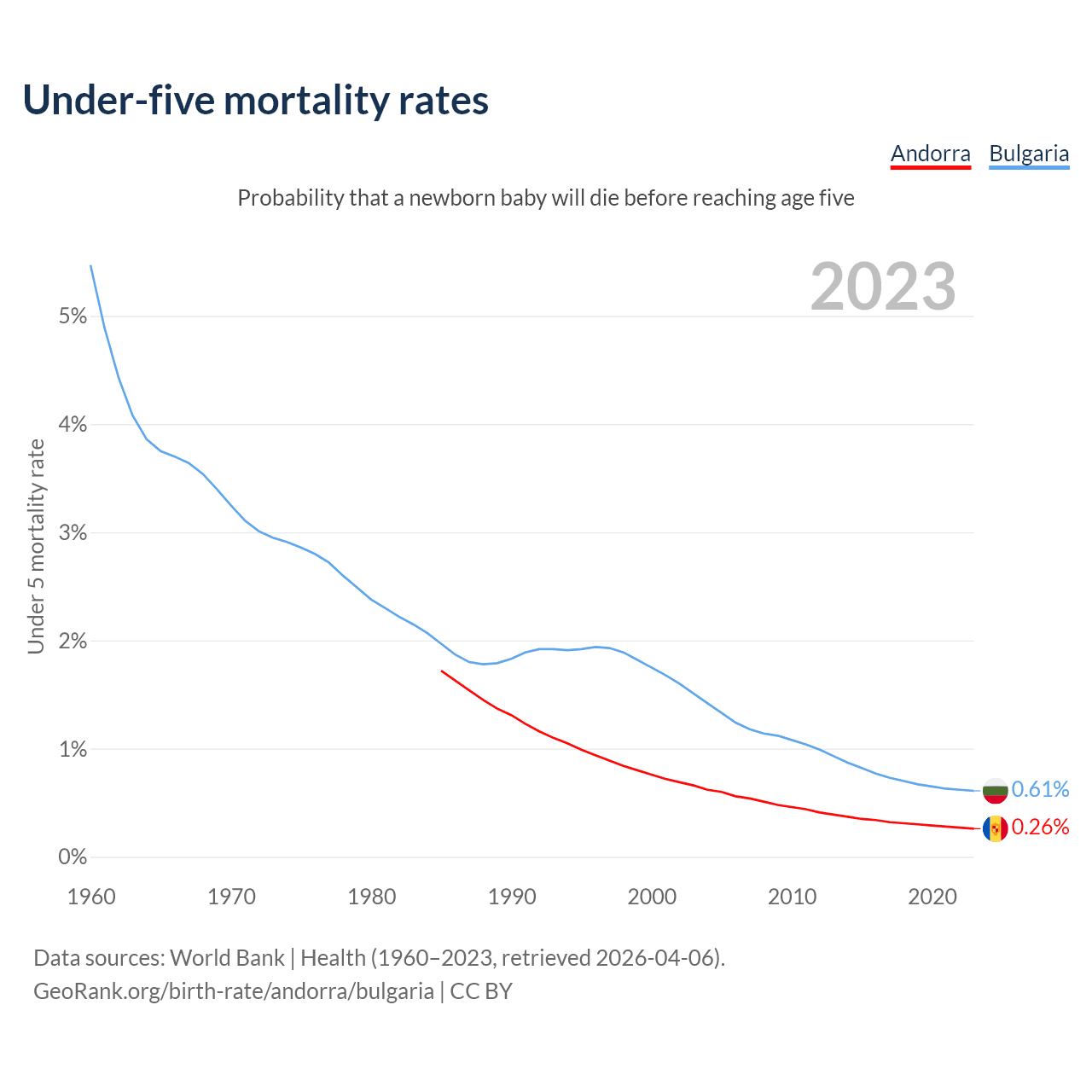 The chance that a newborn baby will die before reaching age five is 0.26% in Andorra and 0.61% in Bulgaria. Above is a chart with historical data on under-five mortality rates.