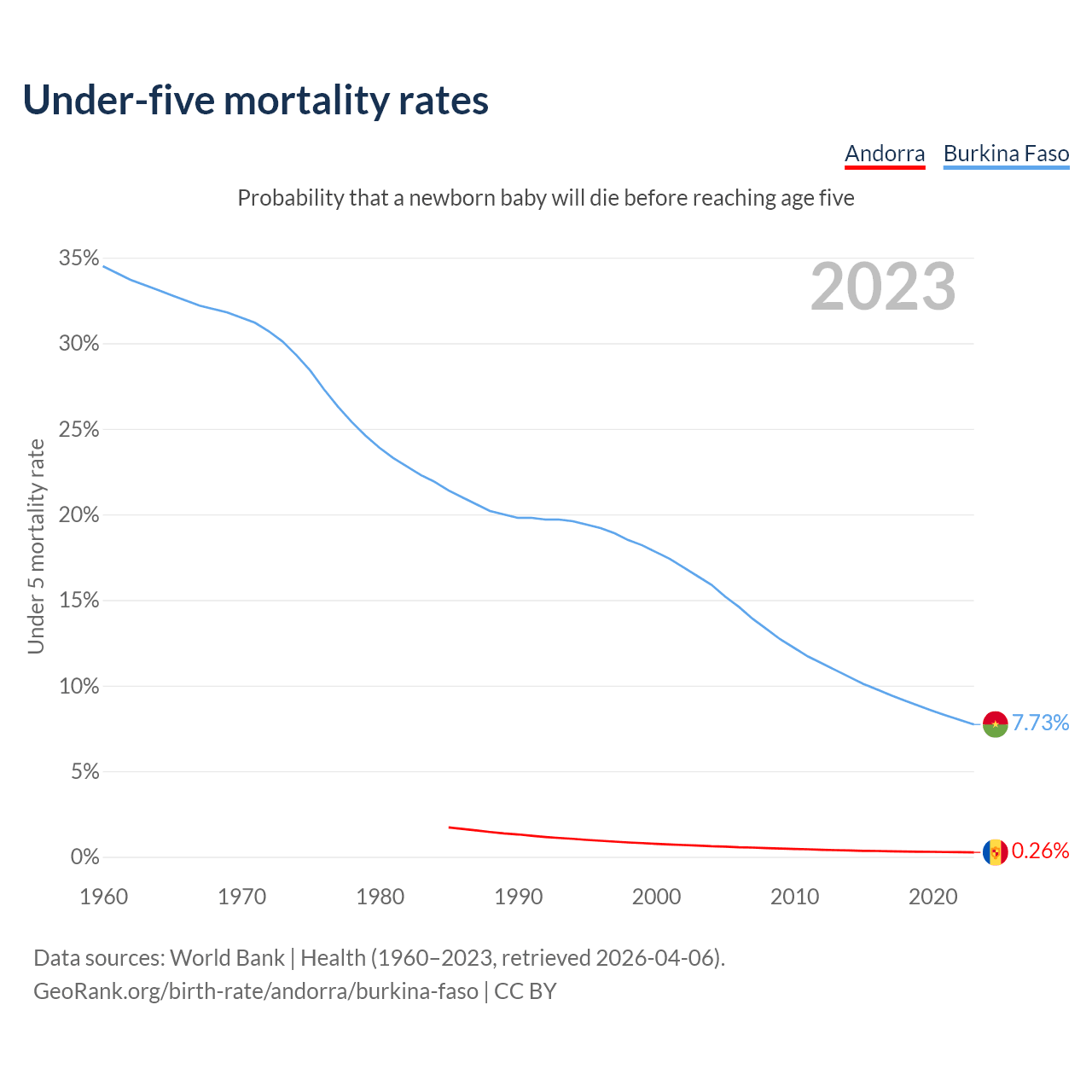 The chance that a newborn baby will die before reaching age five is 0.26% in Andorra and 7.73% in Burkina Faso. Above is a chart with historical data on under-five mortality rates.