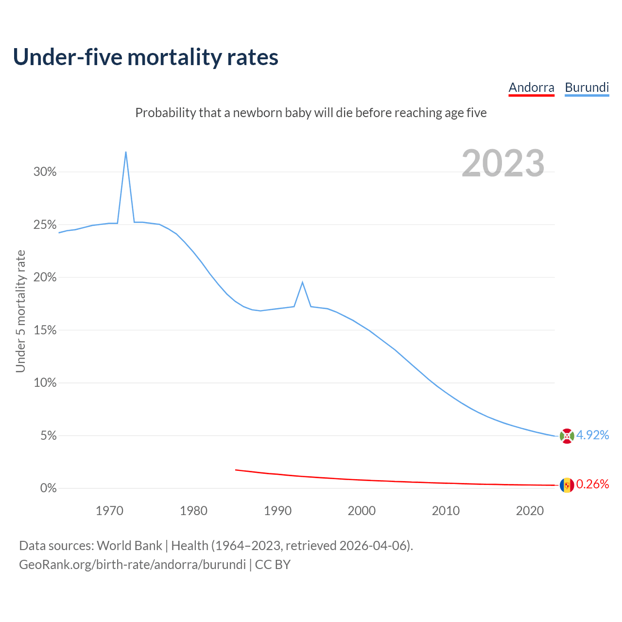 The chance that a newborn baby will die before reaching age five is 0.26% in Andorra and 4.92% in Burundi. Above is a chart with historical data on under-five mortality rates.