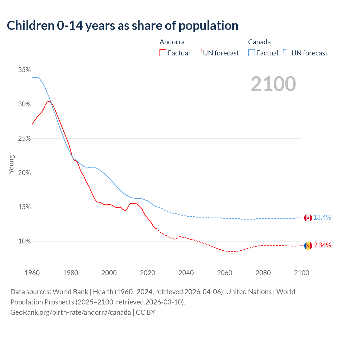 Andorra has an annual birth rate of 6.86 births per 1,000 people, compared to 8.8 for Canada. The average number of children a woman is expected to have during her lifetime — the fertility rate, is 1.08 in Andorra and 1.26 in Canada — 16.5% difference.