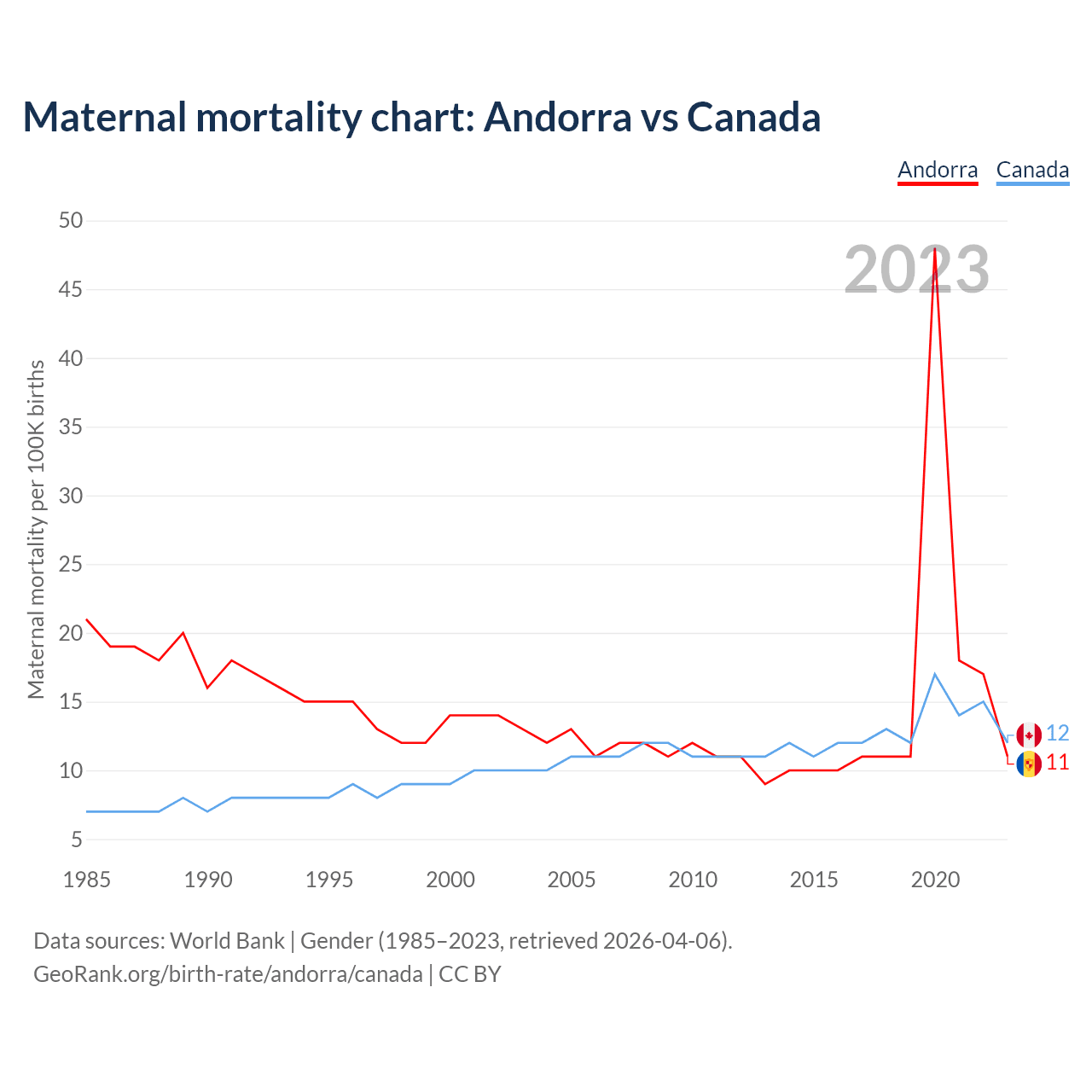 The maternal mortality rate, which is the probability of dying during childbirth or within 42 days of pregnancy termination, is 11 deaths per 100,000 live births in Andorra, compared to 12 deaths in Canada.