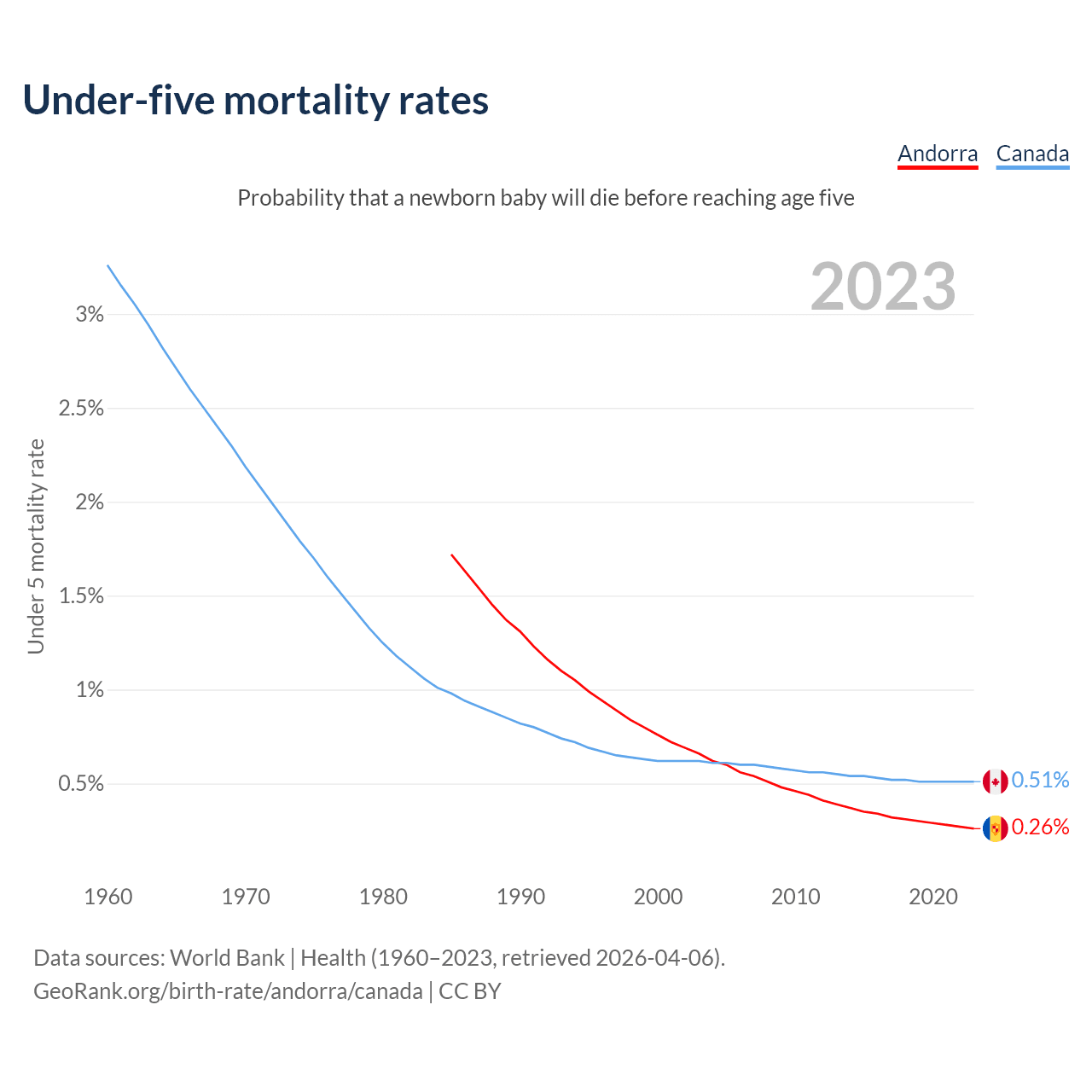 The chance that a newborn baby will die before reaching age five is 0.26% in Andorra and 0.51% in Canada. Above is a chart with historical data on under-five mortality rates.