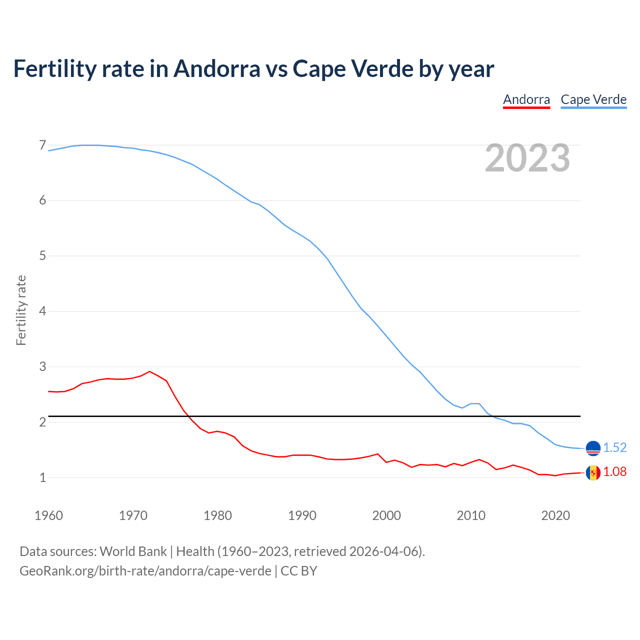 1960 vs 2023, the fertility rate has decreased by 57.5% in Andorra and by 77.9% in Cape Verde — in 1960, it was 2.55 and 6.89, respectively.