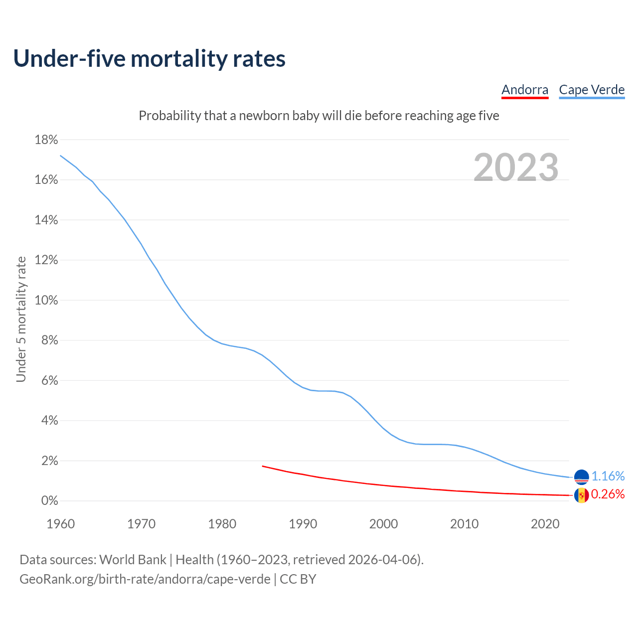 The chance that a newborn baby will die before reaching age five is 0.26% in Andorra and 1.16% in Cape Verde. Above is a chart with historical data on under-five mortality rates.