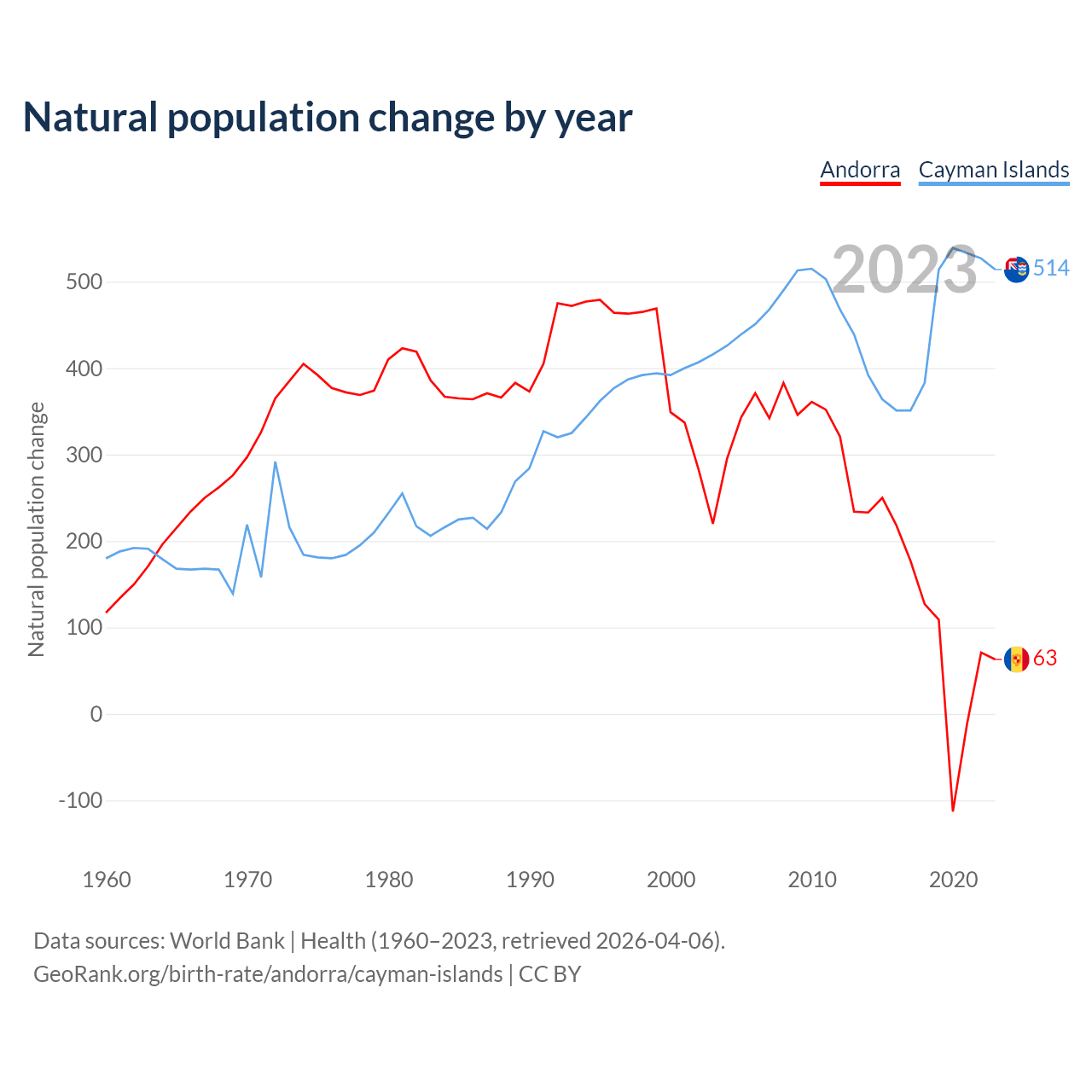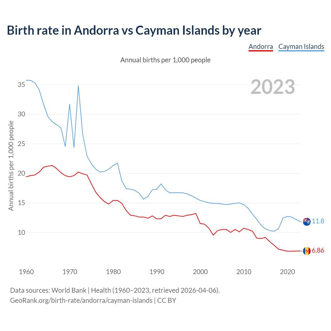 Andorra has an annual birth rate of 6.86 births per 1,000 people, compared to 11.8 for the Cayman Islands. The average number of children a woman is expected to have during her lifetime — the fertility rate, is 1.08 in Andorra and 1.53 in the Cayman Islands — 41.5% difference.