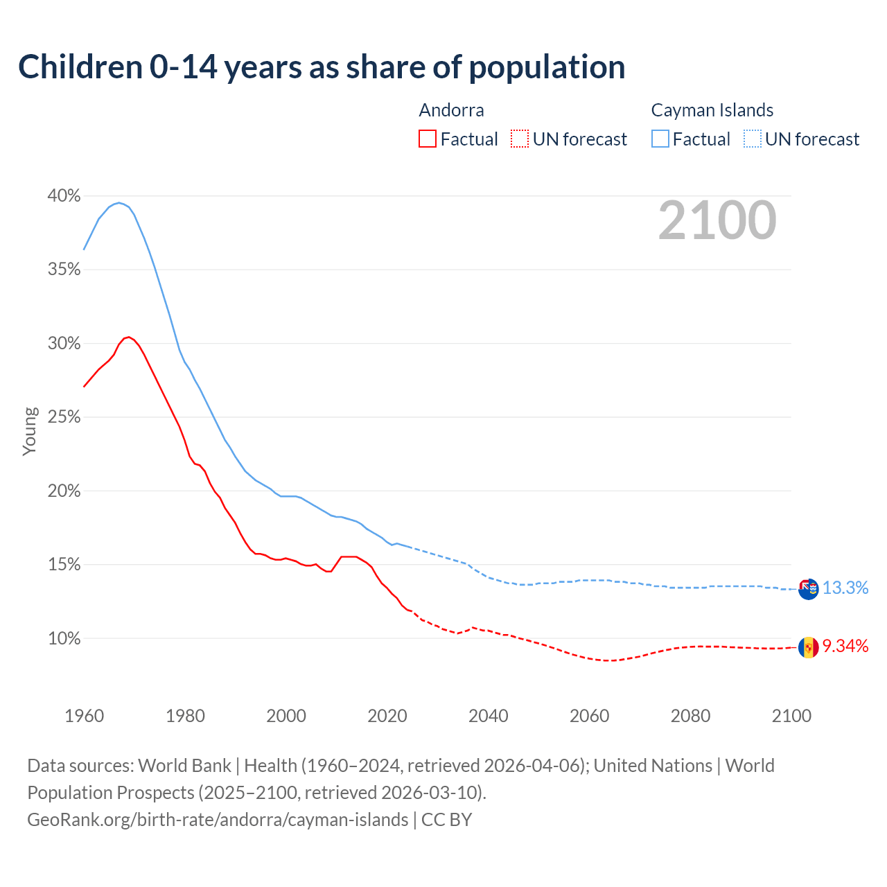 Children aged 0-14 make up 11.9% of the population in Andorra and 16.2% in the Cayman Islands in 2024, compared to 17.8% and 22.3% respectively in 1990.