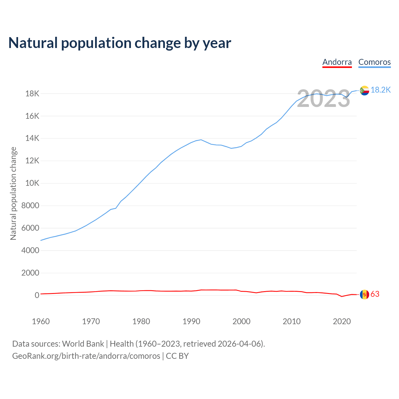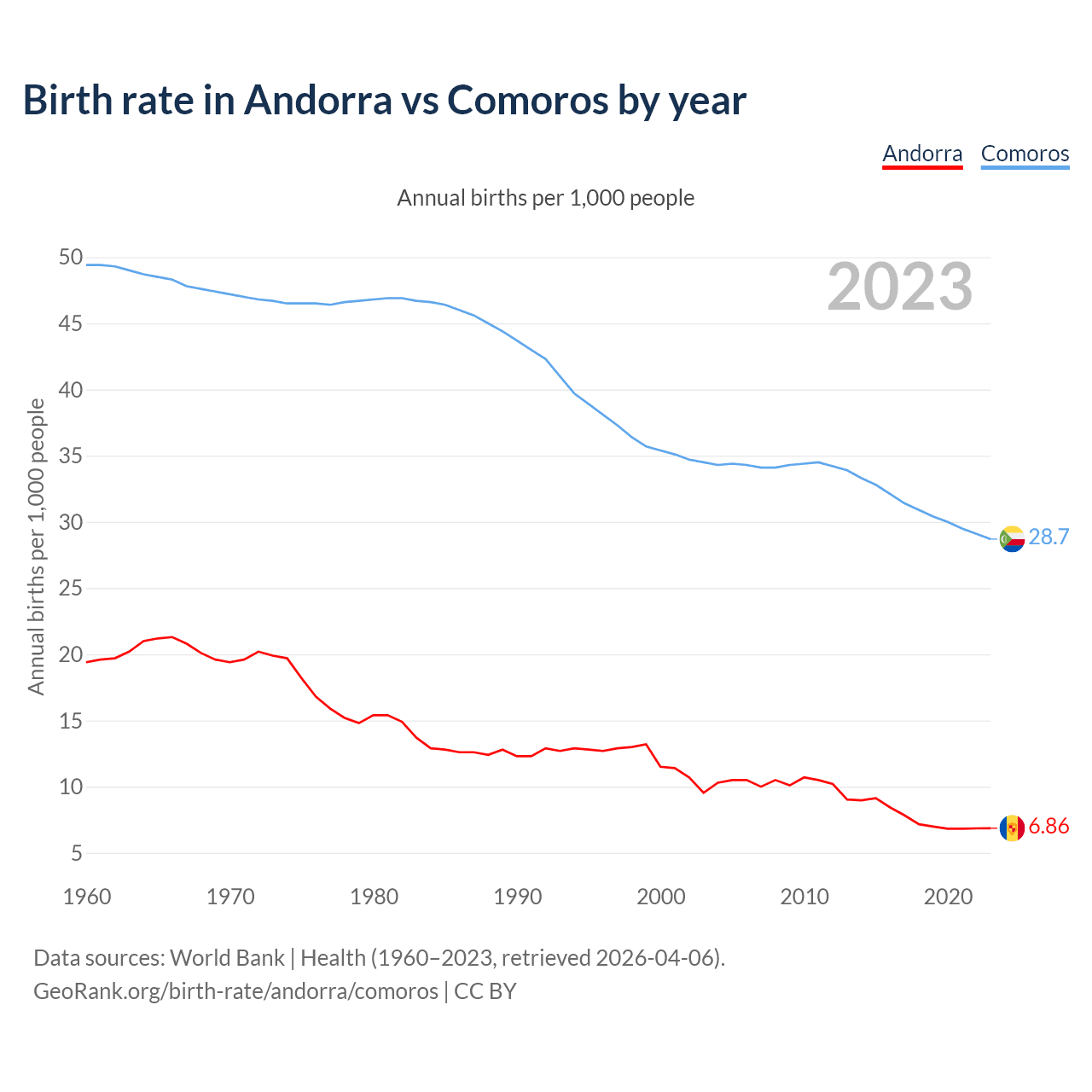 Andorra has an annual birth rate of 6.86 births per 1,000 people, compared to 28.7 for Comoros. The average number of children a woman is expected to have during her lifetime — the fertility rate, is 1.08 in Andorra and 3.88 in Comoros — 258.4% difference.