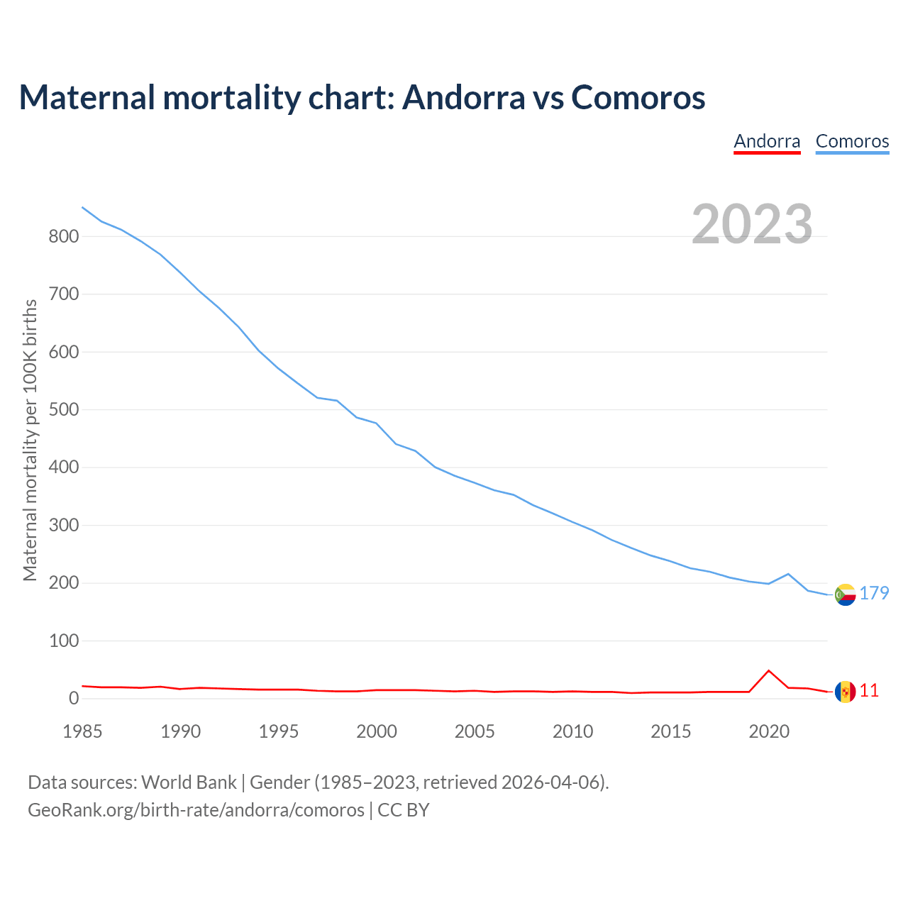 The maternal mortality rate, which is the probability of dying during childbirth or within 42 days of pregnancy termination, is 11 deaths per 100,000 live births in Andorra, compared to 179 deaths in Comoros.