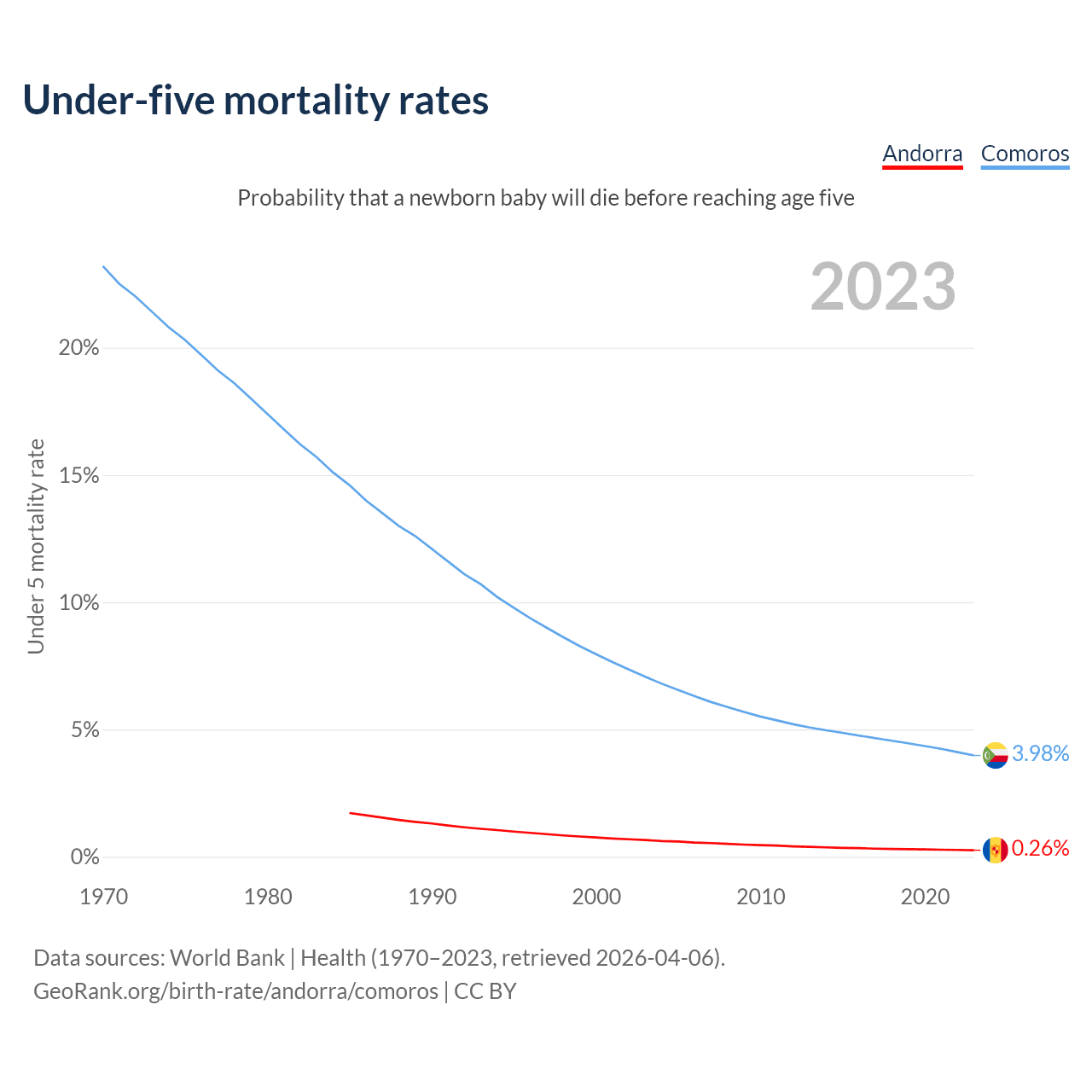 The chance that a newborn baby will die before reaching age five is 0.26% in Andorra and 3.98% in Comoros. Above is a chart with historical data on under-five mortality rates.