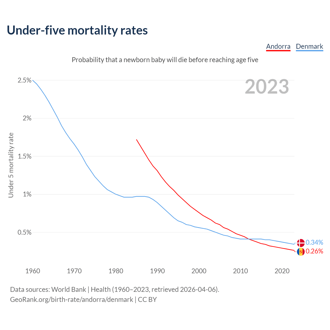 The chance that a newborn baby will die before reaching age five is 0.26% in Andorra and 0.34% in Denmark. Above is a chart with historical data on under-five mortality rates.