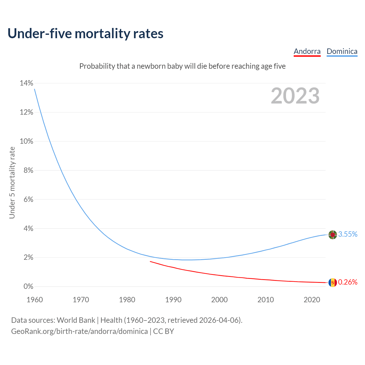 The chance that a newborn baby will die before reaching age five is 0.26% in Andorra and 3.55% in Dominica. Above is a chart with historical data on under-five mortality rates.