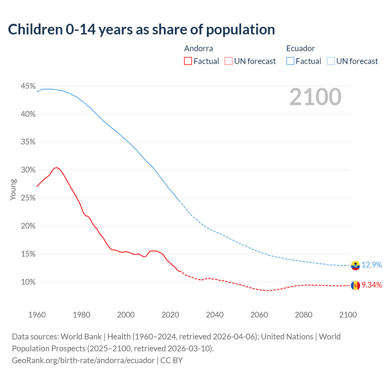 According to the latest available data on birth rates, the fertility rate in Andorra was 1.08 children per woman in 2023, compared to 1.82 in Ecuador in 2023. The replacement level is considered to be 2.1 children per woman.