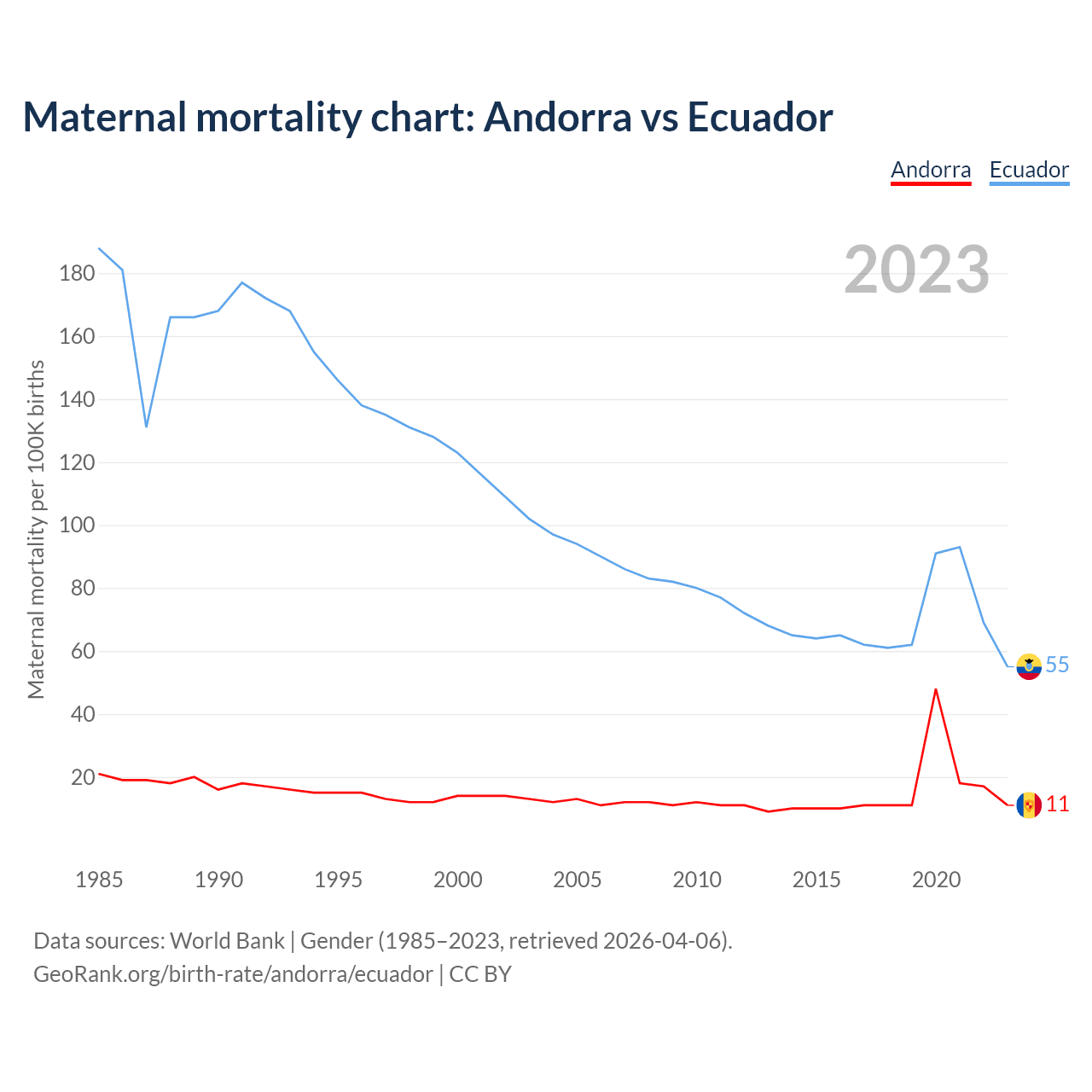 The maternal mortality rate, which is the probability of dying during childbirth or within 42 days of pregnancy termination, is 11 deaths per 100,000 live births in Andorra, compared to 55 deaths in Ecuador.
