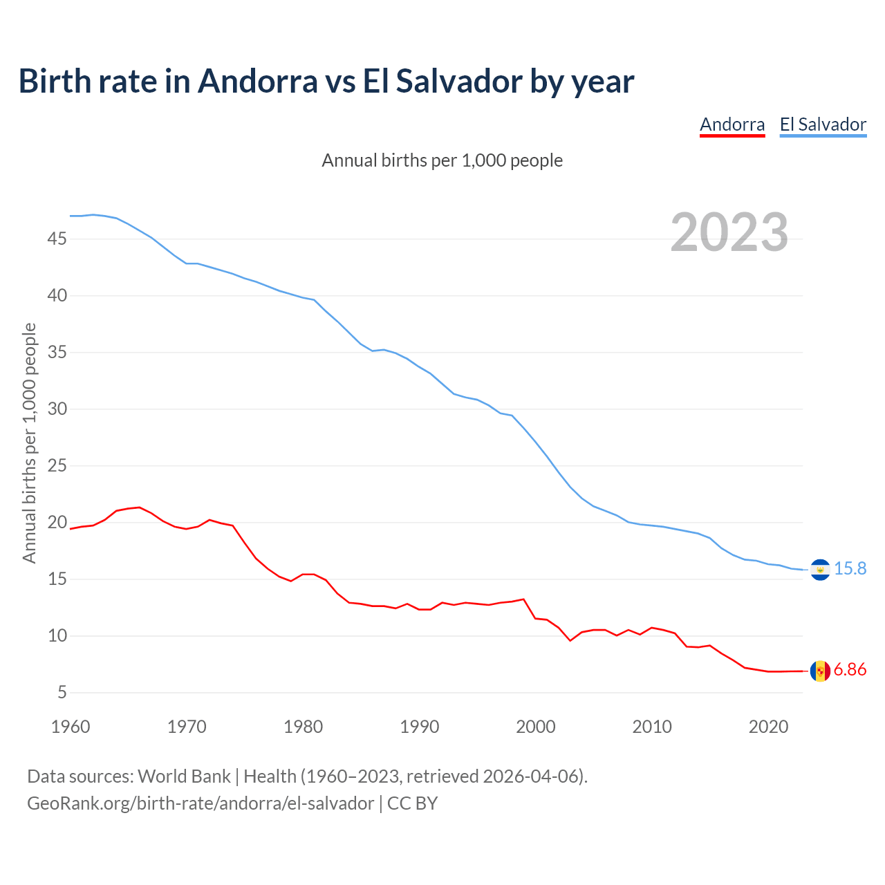 Andorra has an annual birth rate of 6.86 births per 1,000 people, compared to 15.8 for El Salvador. The average number of children a woman is expected to have during her lifetime — the fertility rate, is 1.08 in Andorra and 1.78 in El Salvador — 64% difference.