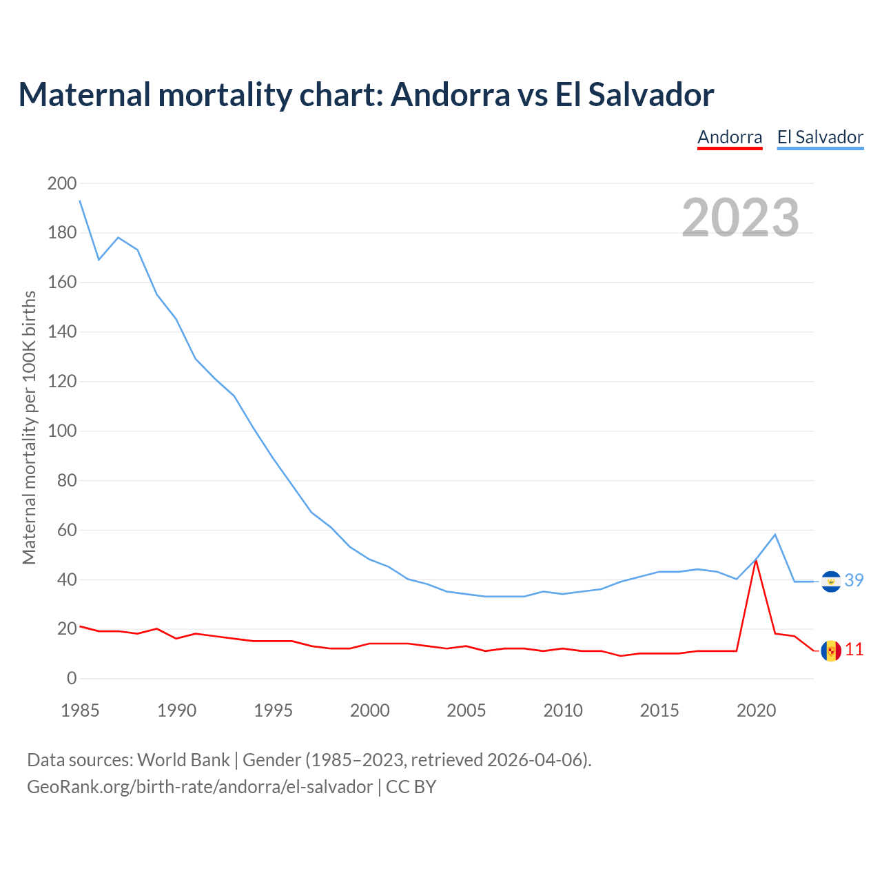 The maternal mortality rate, which is the probability of dying during childbirth or within 42 days of pregnancy termination, is 11 deaths per 100,000 live births in Andorra, compared to 39 deaths in El Salvador.