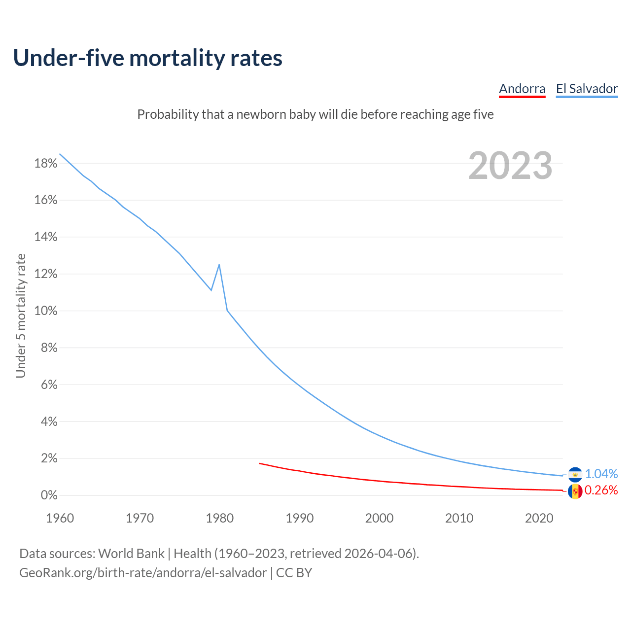 The chance that a newborn baby will die before reaching age five is 0.26% in Andorra and 1.04% in El Salvador. Above is a chart with historical data on under-five mortality rates.