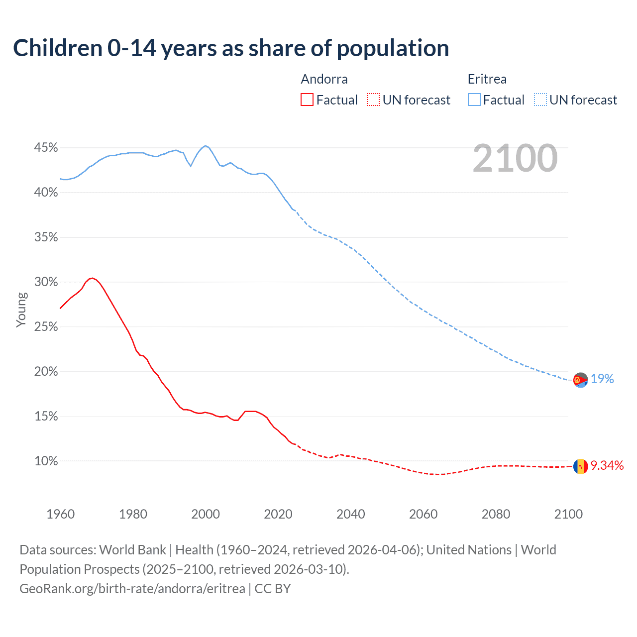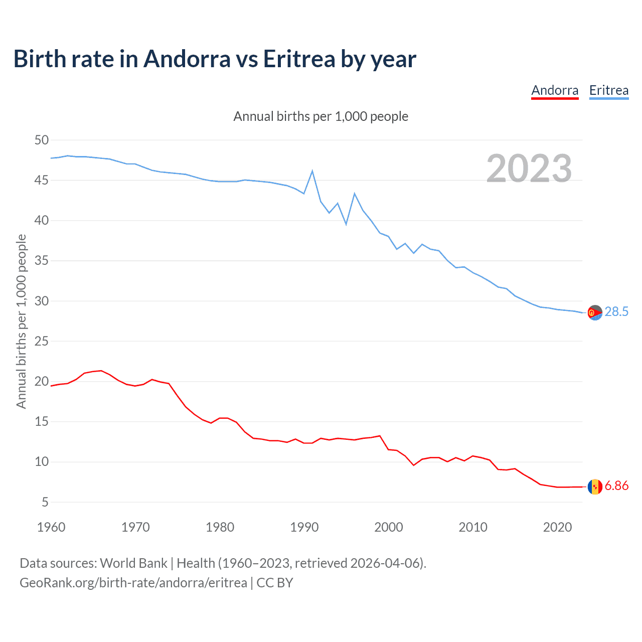Andorra has an annual birth rate of 6.86 births per 1,000 people, compared to 28.5 for Eritrea. The average number of children a woman is expected to have during her lifetime — the fertility rate, is 1.08 in Andorra and 3.71 in Eritrea — 243.2% difference.