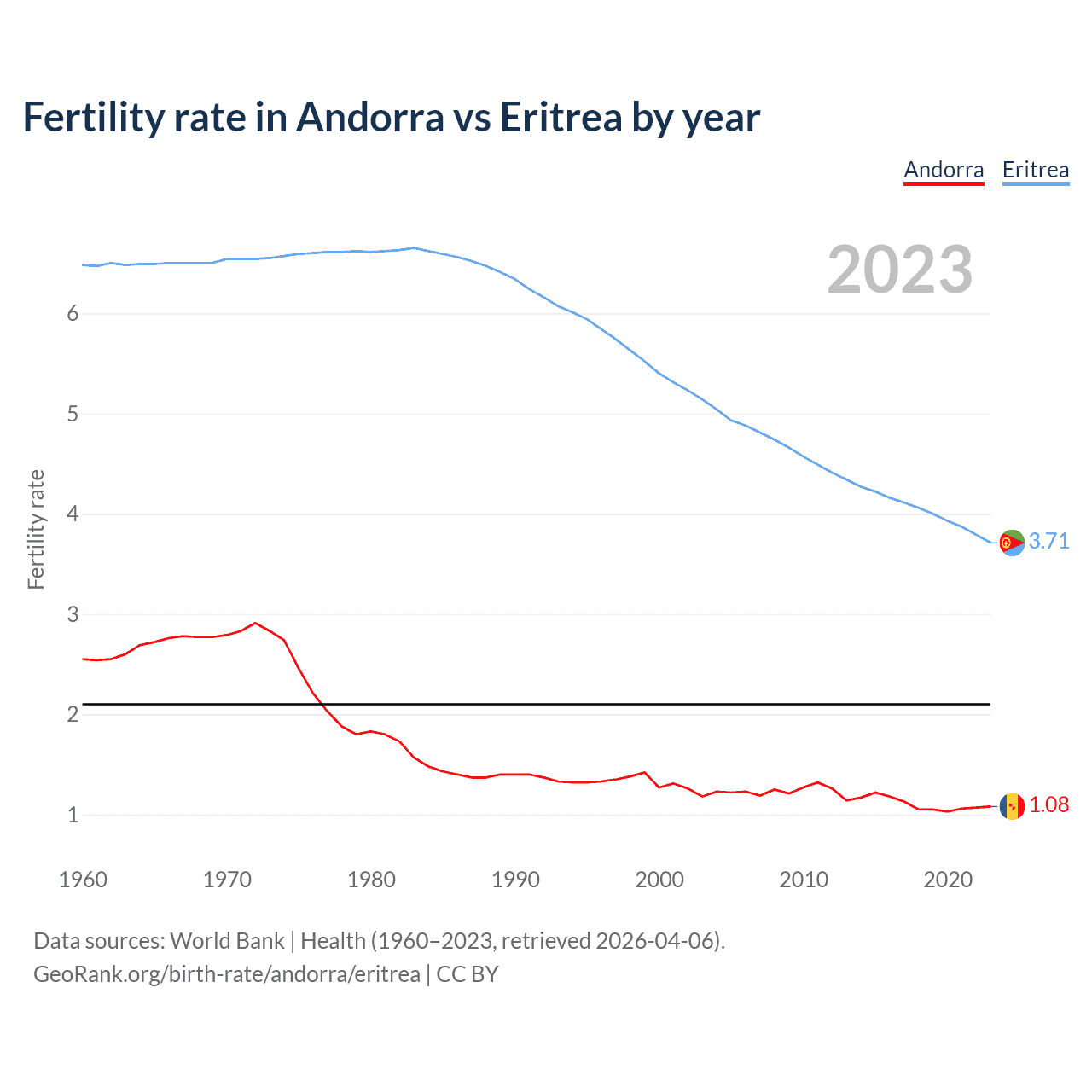 According to the latest available data on birth rates, the fertility rate in Andorra was 1.08 children per woman in 2023, compared to 3.71 in Eritrea in 2023. The replacement level is considered to be 2.1 children per woman.