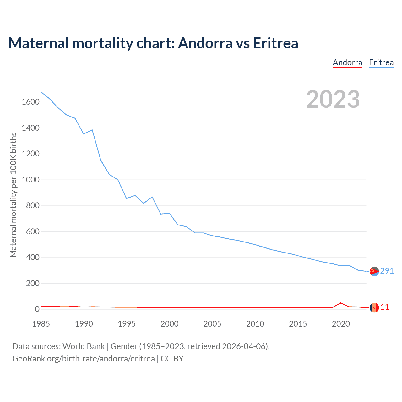 The maternal mortality rate, which is the probability of dying during childbirth or within 42 days of pregnancy termination, is 11 deaths per 100,000 live births in Andorra, compared to 291 deaths in Eritrea.