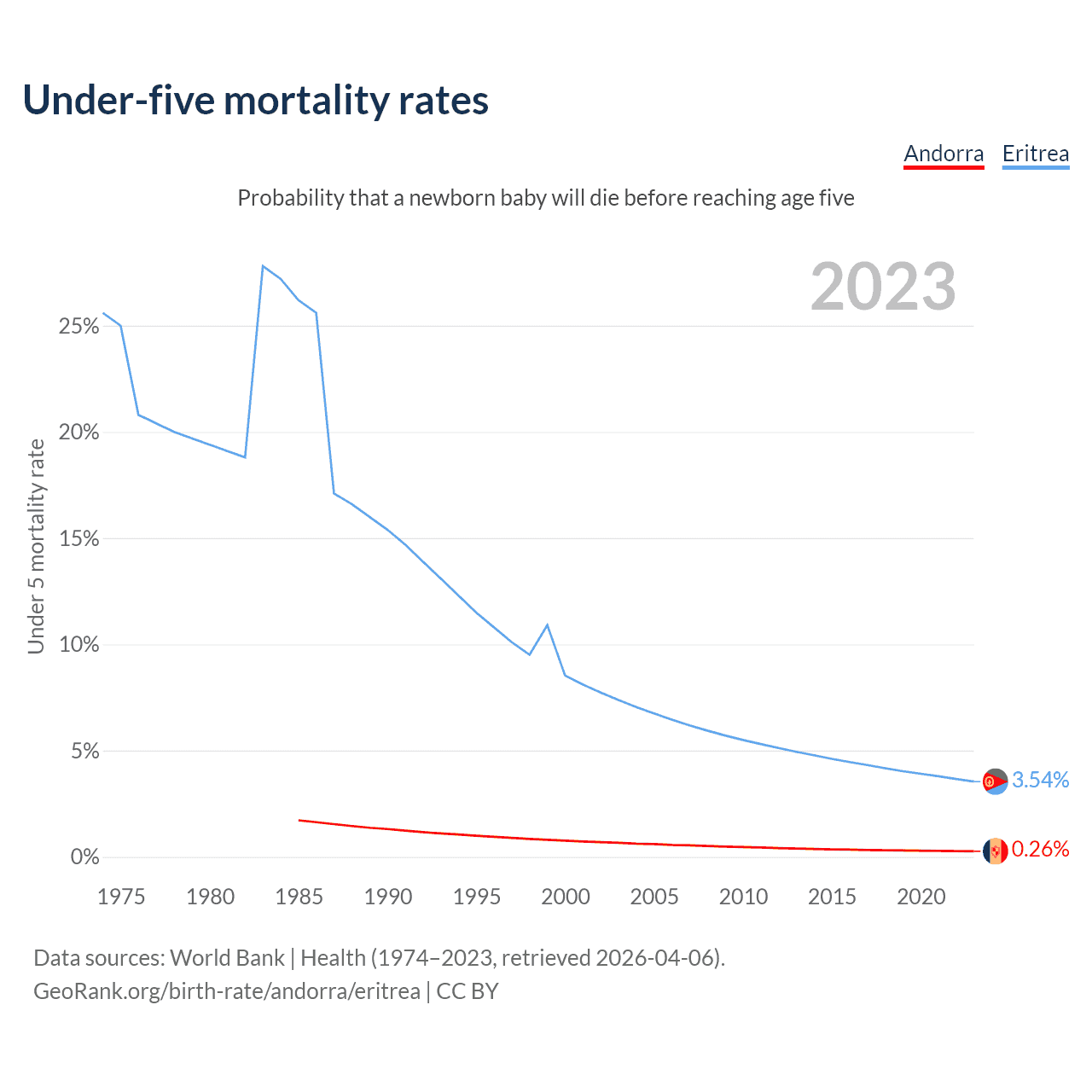 The chance that a newborn baby will die before reaching age five is 0.26% in Andorra and 3.54% in Eritrea. Above is a chart with historical data on under-five mortality rates.