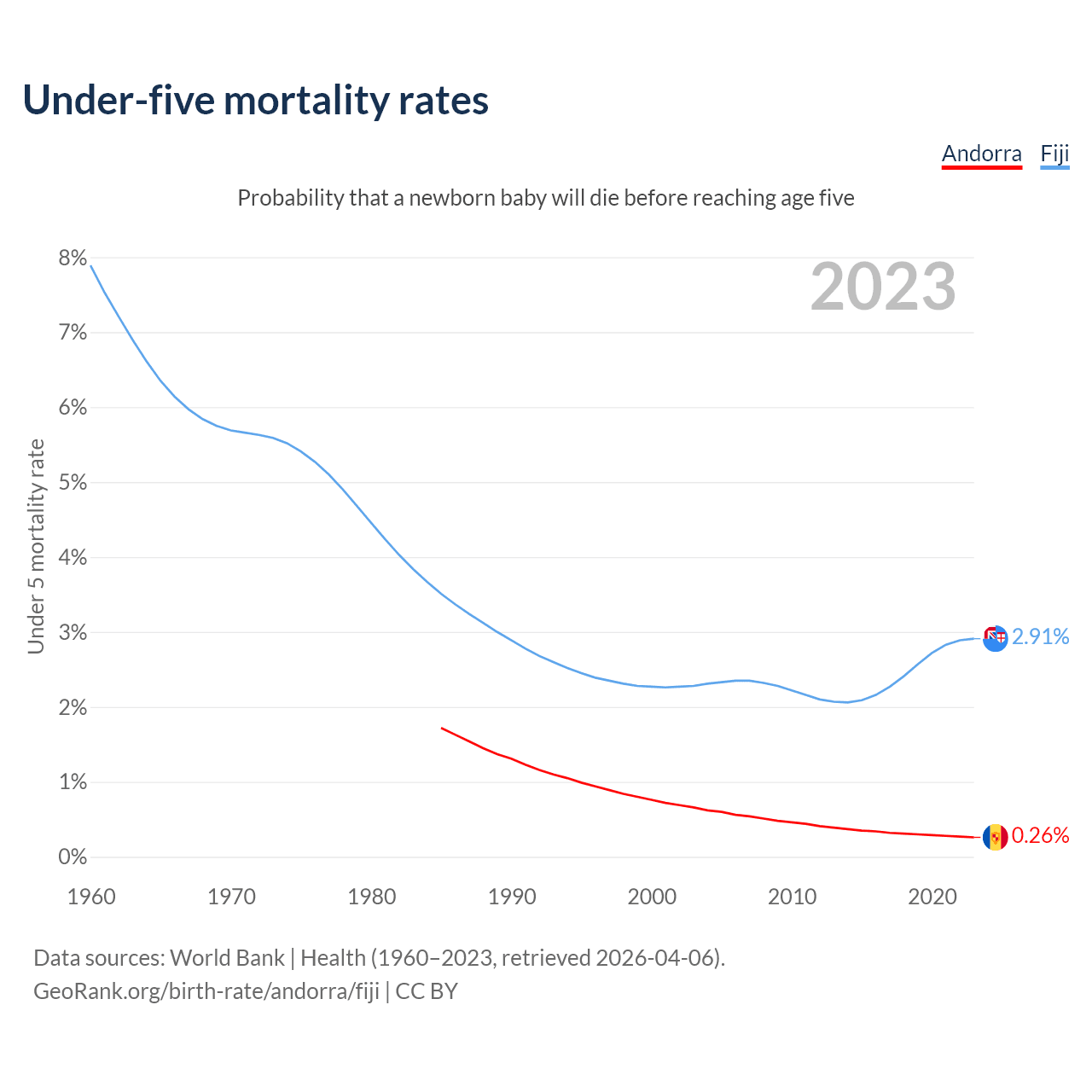 The chance that a newborn baby will die before reaching age five is 0.26% in Andorra and 2.91% in Fiji. Above is a chart with historical data on under-five mortality rates.