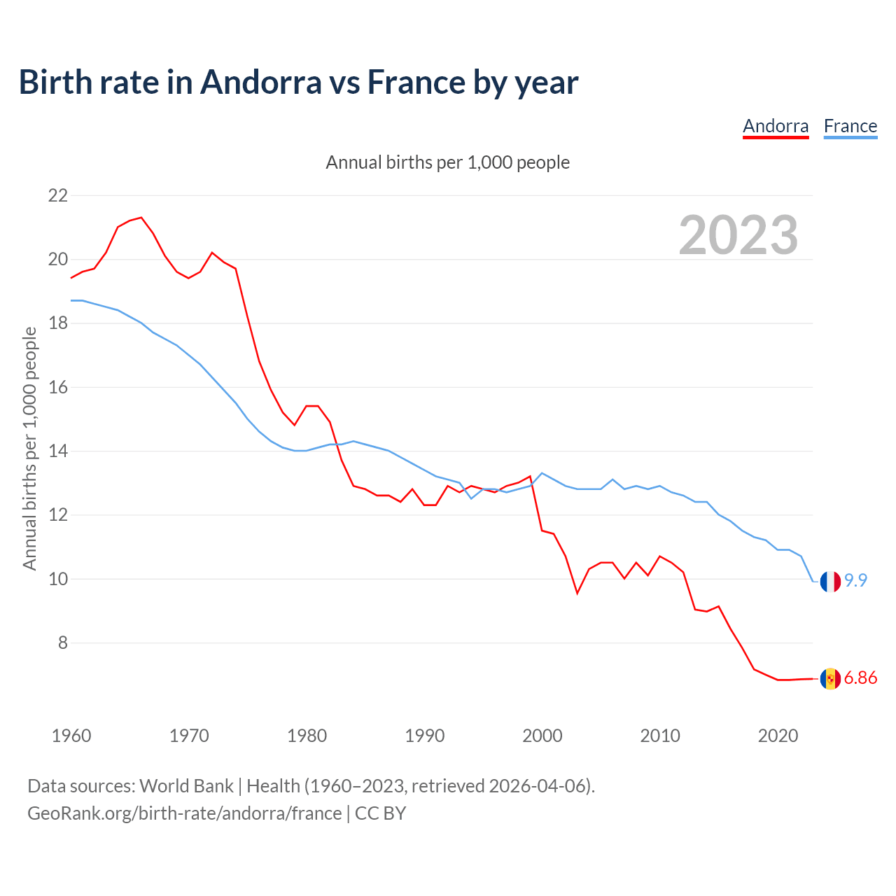 Andorra has an annual birth rate of 6.86 births per 1,000 people, compared to 9.9 for France. The average number of children a woman is expected to have during her lifetime — the fertility rate, is 1.08 in Andorra and 1.66 in France — 53.4% difference.
