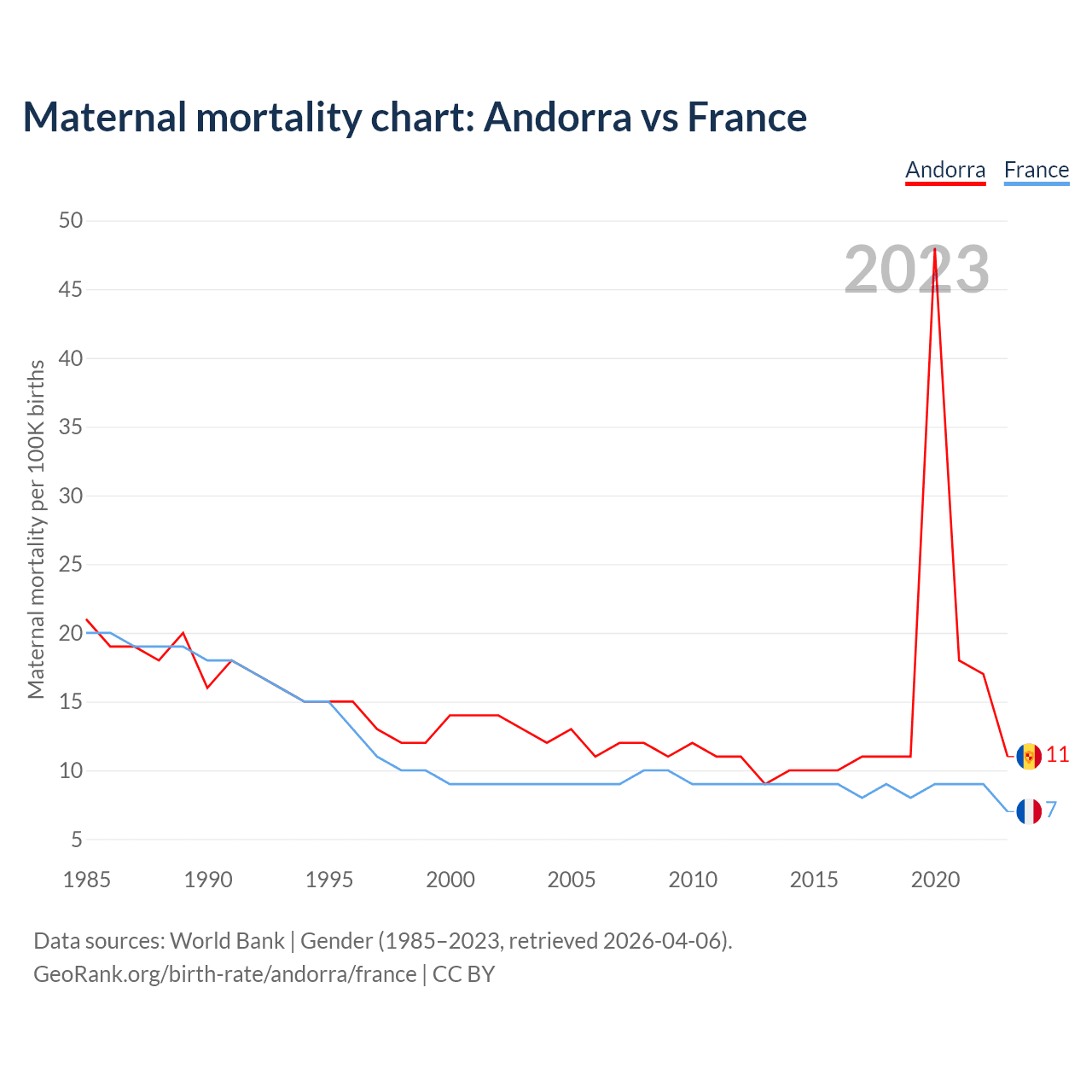 The maternal mortality rate, which is the probability of dying during childbirth or within 42 days of pregnancy termination, is 11 deaths per 100,000 live births in Andorra, compared to 7 deaths in France.