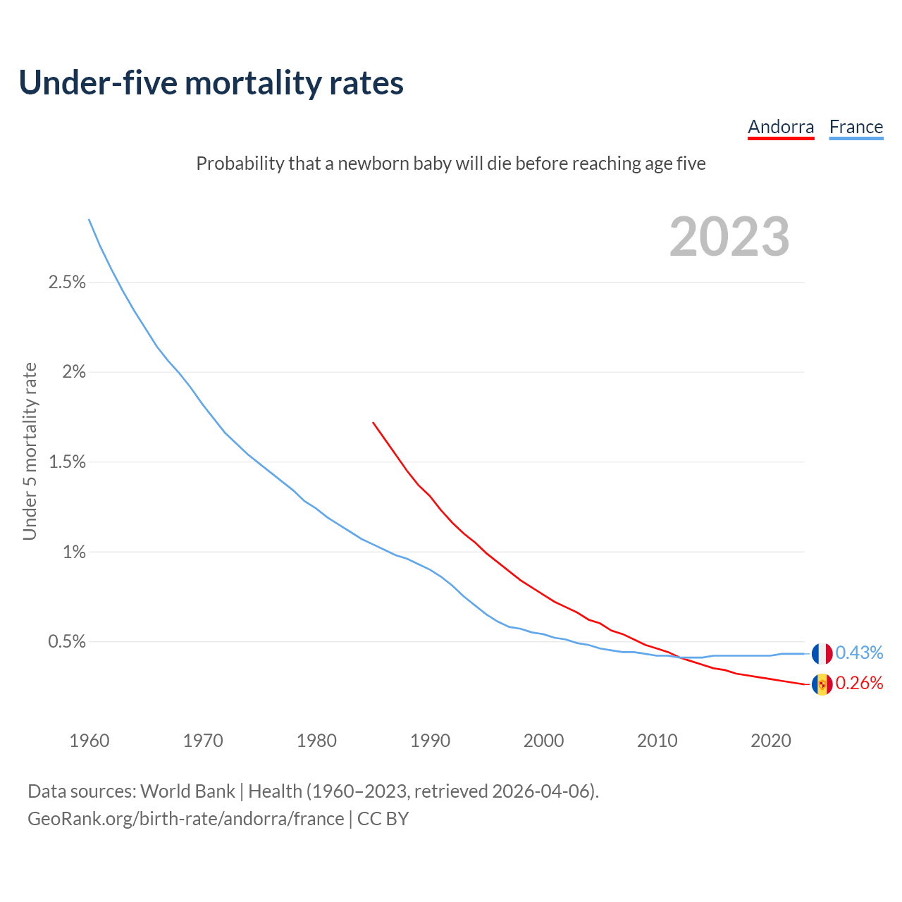 The chance that a newborn baby will die before reaching age five is 0.26% in Andorra and 0.43% in France. Above is a chart with historical data on under-five mortality rates.