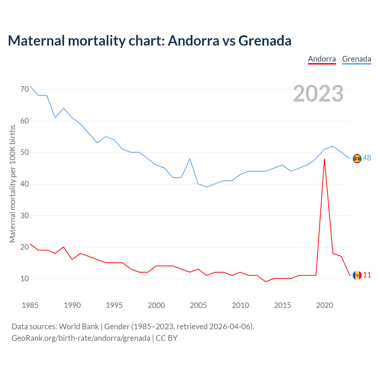 The maternal mortality rate, which is the probability of dying during childbirth or within 42 days of pregnancy termination, is 11 deaths per 100,000 live births in Andorra, compared to 48 deaths in Grenada.